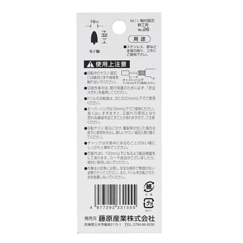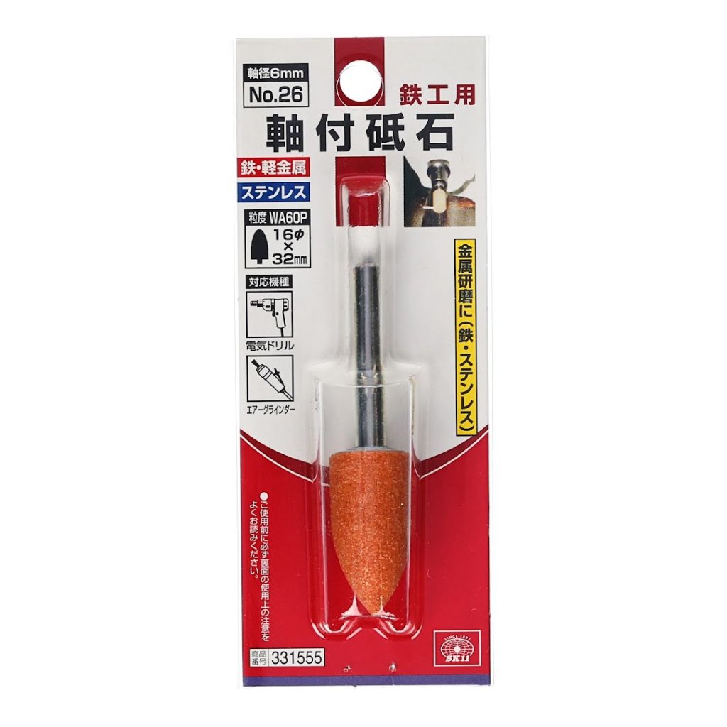 The SK11 Abrasive Stone Point No.26 is ideal for grinding and shaping iron, stainless steel, and other metals. Designed for use with electric drills and air grinders, this tool features a 6 mm shank diameter and a 16mm grinding width. Maintaining an overhang of less than 15 mm is essential for optimal performance. The abrasive stone point measures 15 mm in width, 67 mm in height, and 15 mm in depth, and weighs 40 g. Ensure that the drill's rotation speed does not exceed 30000 RPM.