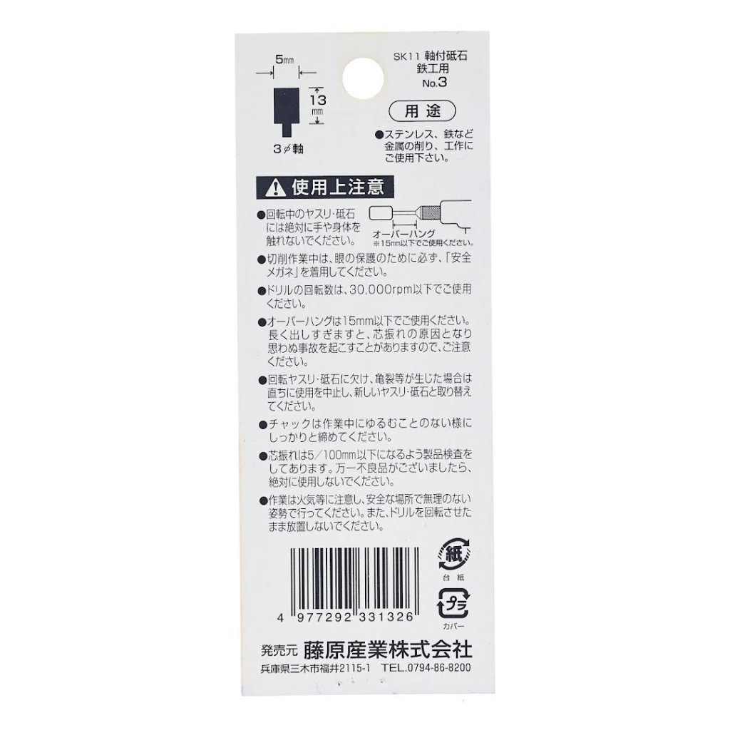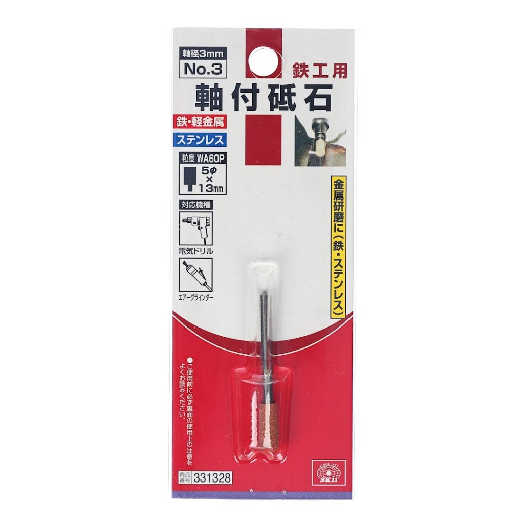The SK11 The Abrasive Stone Point No.3 is ideal for grinding and crafting metal, including iron and stainless steel. Designed for use with electric drills and air grinders, this tool boasts a shaft diameter of 3 mm and a grit size of WA60P. The stone measures 5 mm wide, making it suitable for precise metalworking tasks. Ensure the drill's speed does not exceed 30000 RPM during use.