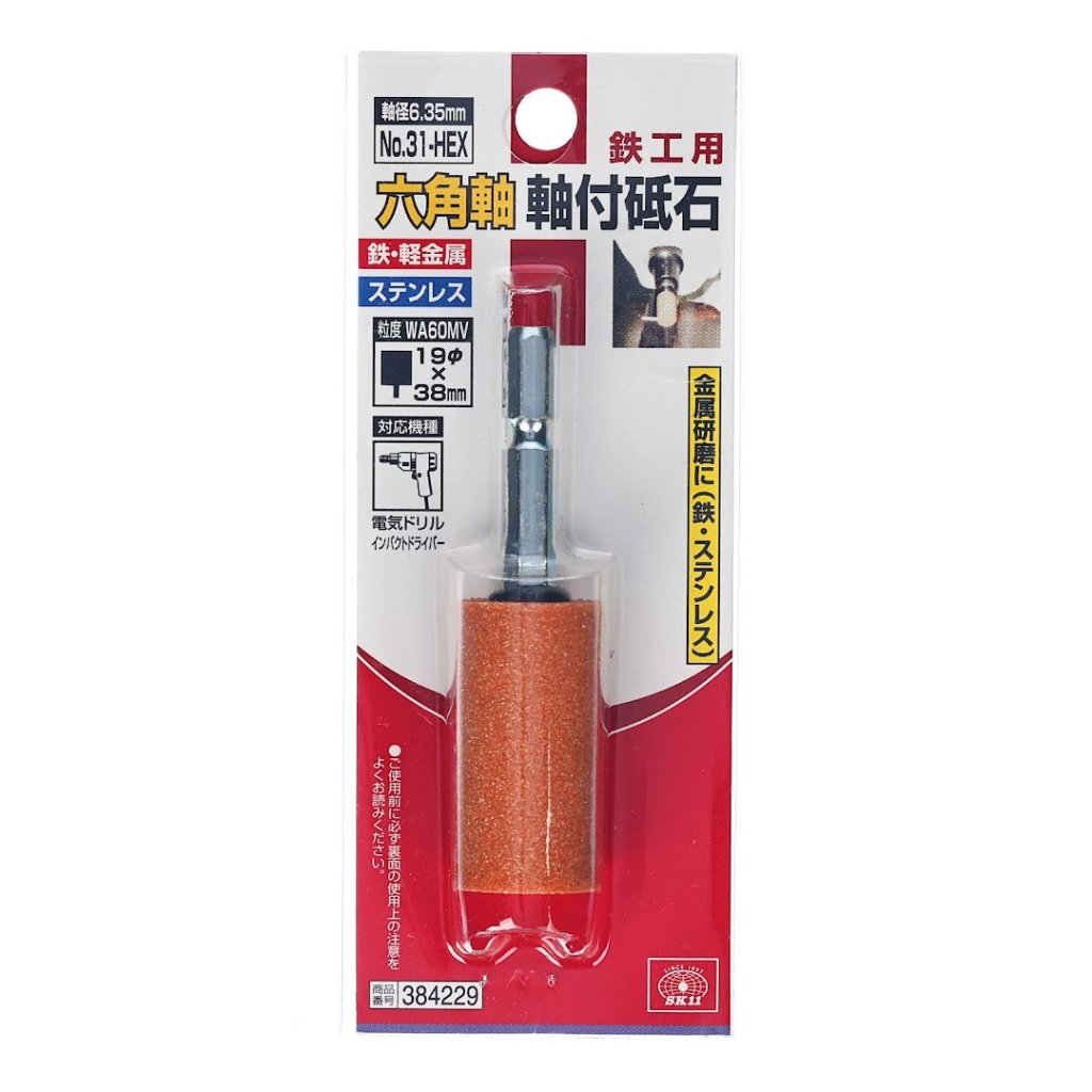The SK11 Abrasive Stone Point No.31-HEX is designed for precise metal grinding tasks on materials like stainless steel and iron. Its hexagonal shaft (6.35 mm) allows easy attachment to impact drivers, making it ideal for quick tool changes. Measuring 19 x 38 mm and weighing just 35 g, it supports a maximum drill rotation speed of 5000 RPM. Ensure safe operation by using protective eyewear and maintaining an overhang of 15 mm or less during use.