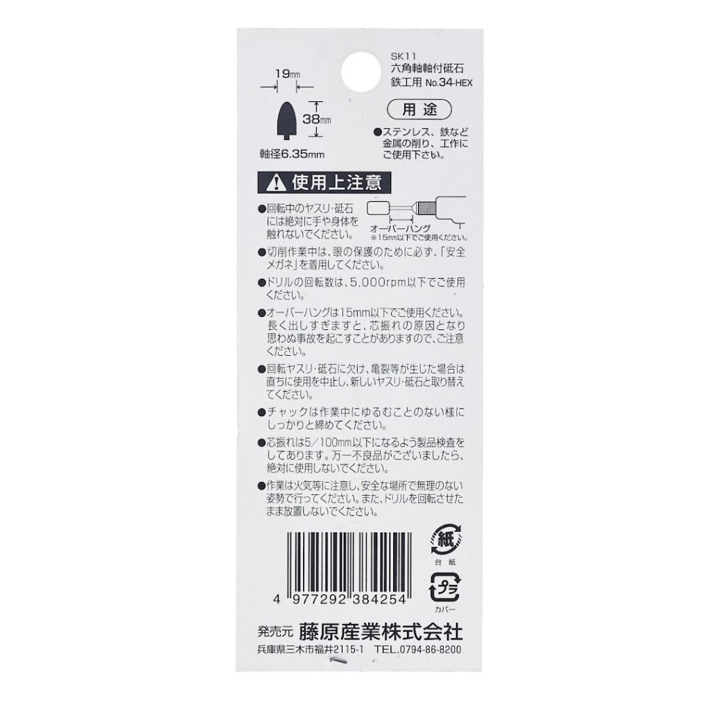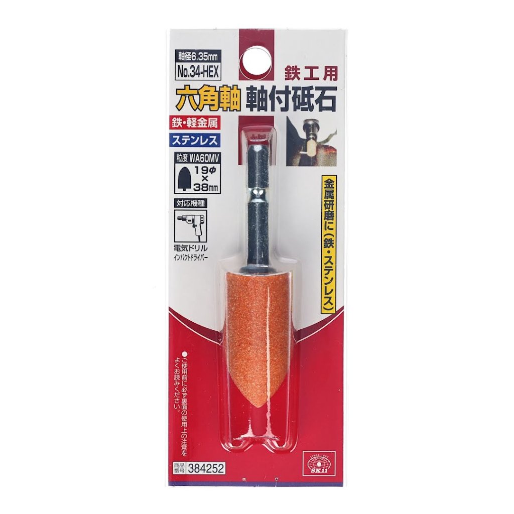 The SK11 Abrasive Stone Point No.34-HEX is ideal for grinding and polishing metal surfaces such as stainless steel and iron. This tool features a 6.35 mm hexagonal shank that allows easy attachment to an impact driver. Its WA60MV grit and 19 x 38 mm diameter provide efficient performance at drill speeds of up to 5000 RPM. Ensure safety by wearing protective glasses and avoiding contact with the rotating abrasive.