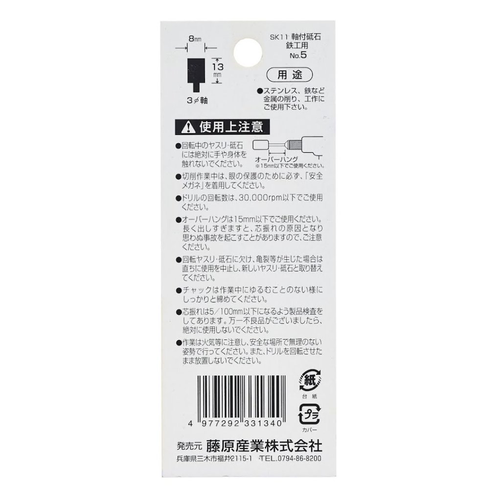 The SK11 Abrasive Stone Point No.5 is ideal for grinding and shaping metals such as iron, light metals, and stainless steel. Designed for use with electric drills and air grinders, this versatile tool features a 3mm shank diameter and a WA60P grit size. For optimal performance, ensure an overhang of 15 mm or less and a drill speed under 30000 RPM. The product measures 7 x 43 x 7 mm and weighs 20 g.
