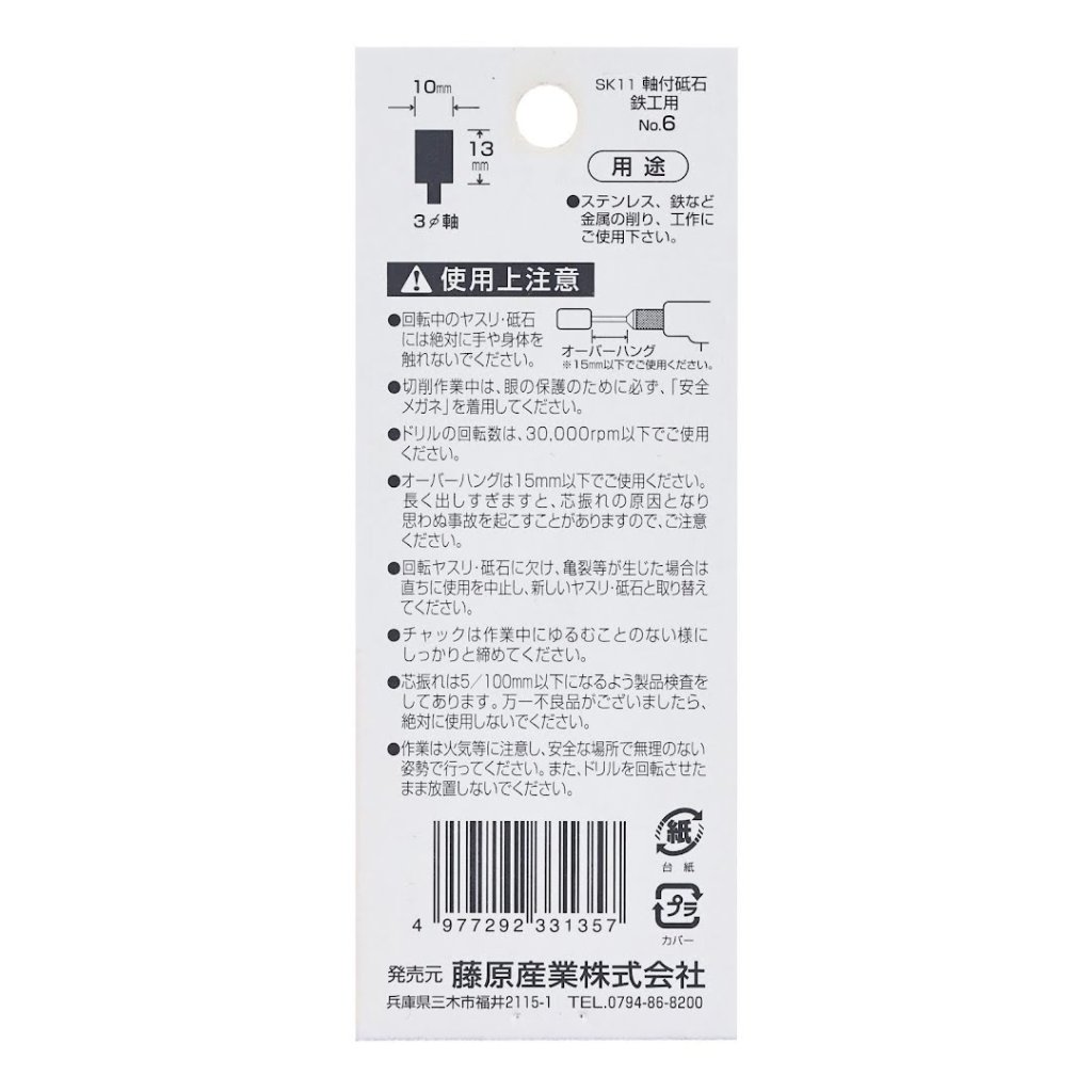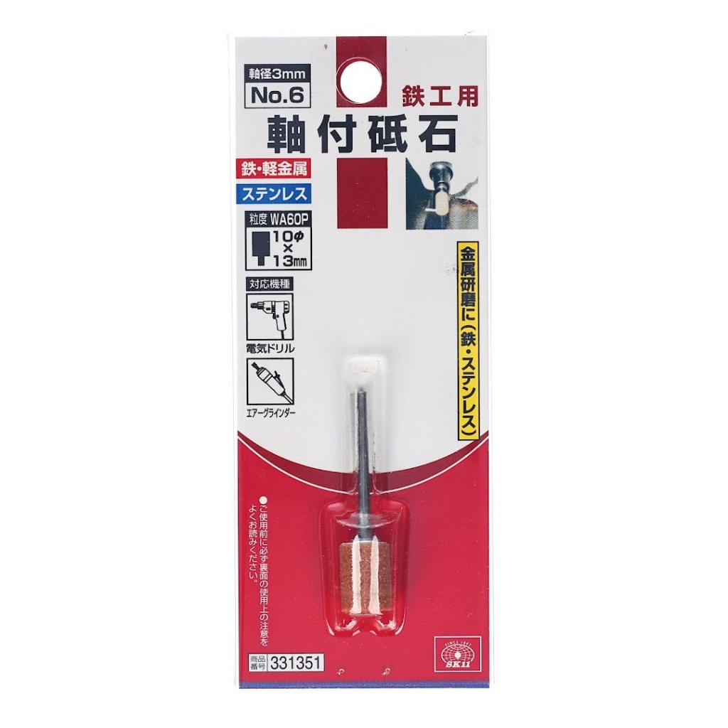 The SK11 Abrasive Stone Point No.6 is designed for grinding and crafting metals such as iron, light metals, and stainless steel. This product, with dimensions of 10 x 45 x 10 mm and weighing 20 g, is ideal for electric drills and air grinders. It features a shaft diameter of 3 mm and a grit size of WA60P. Ensure safe operation by keeping the drill's rotation speed below 30000 RPM.