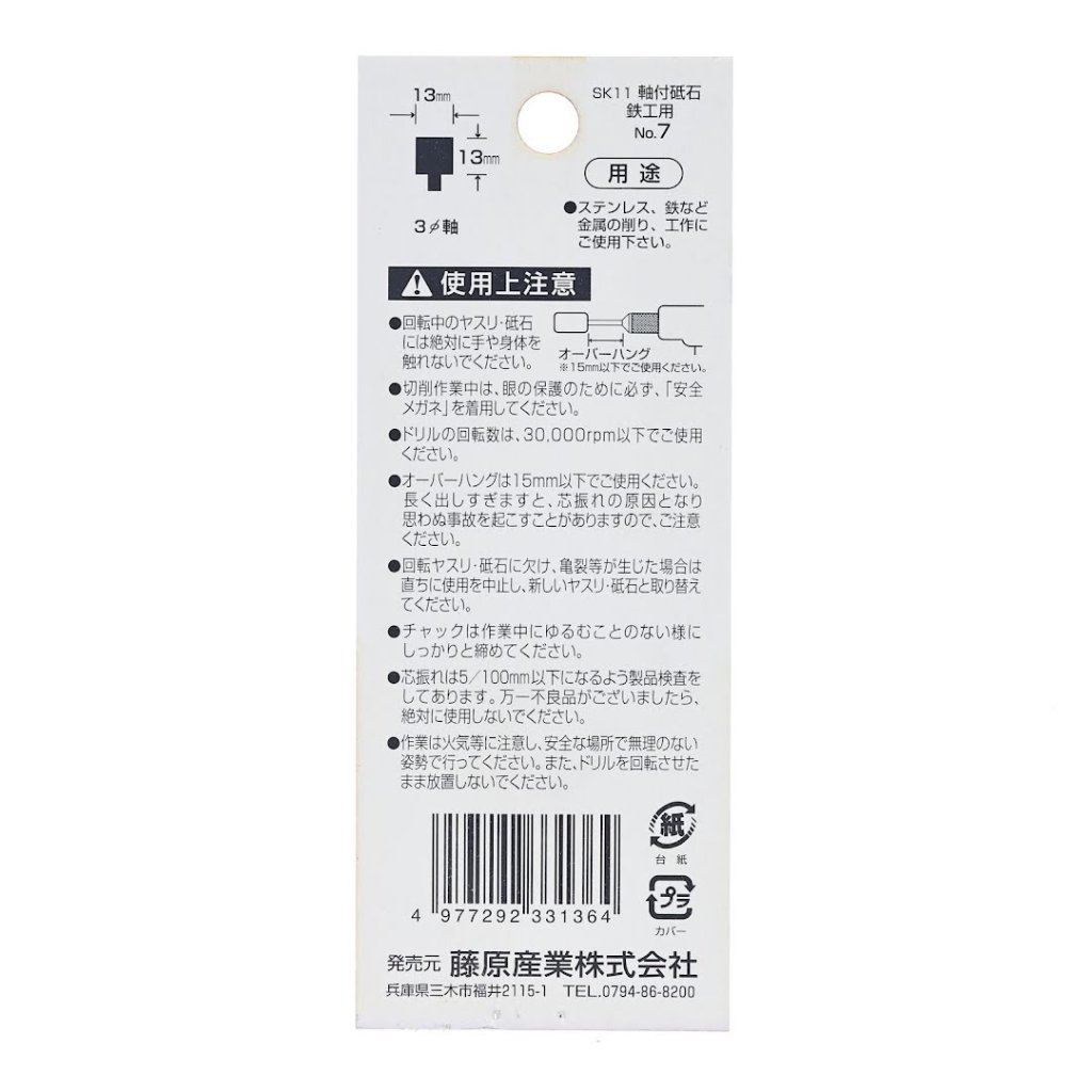 The SK11 Abrasive Stone Point No.7 is ideal for grinding and working with metals such as iron and stainless steel. Designed for use with electric drills and air grinders, this metalworking file features a 3 mm shank diameter and WA60P grit. For optimal performance, ensure an overhang of 15 mm or less and operate at speeds below 30000 RPM.