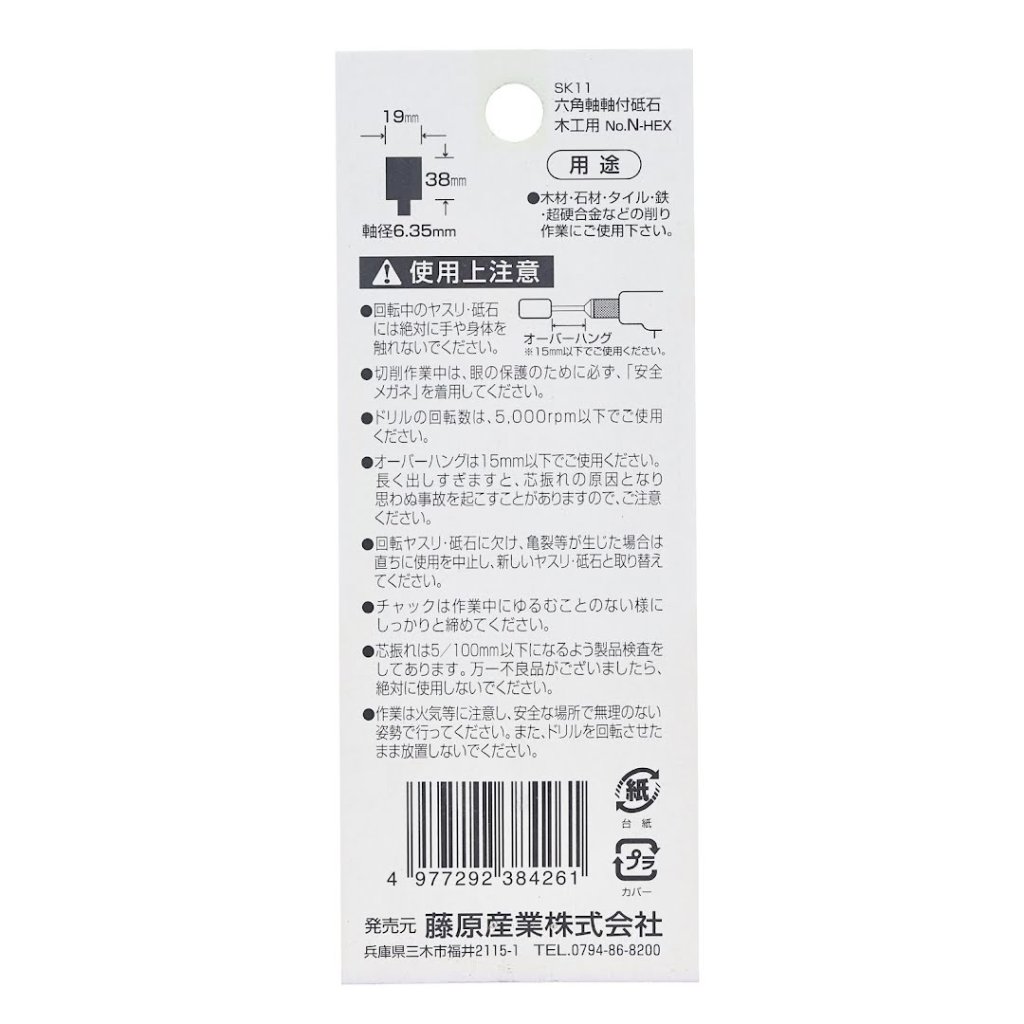 The SK11 Abrasive Stone Point, model No.N-HEX, is designed to grind efficiently and polish wood, stone, tile, iron, and carbide. Its 6.35mm hex shank easily attaches to an impact driver for versatile use. The stone measures 19 x 38 mm and operates at speeds up to 5000 RPM. It is ideal for detailed and precise work and ensures a smooth finish on various materials.