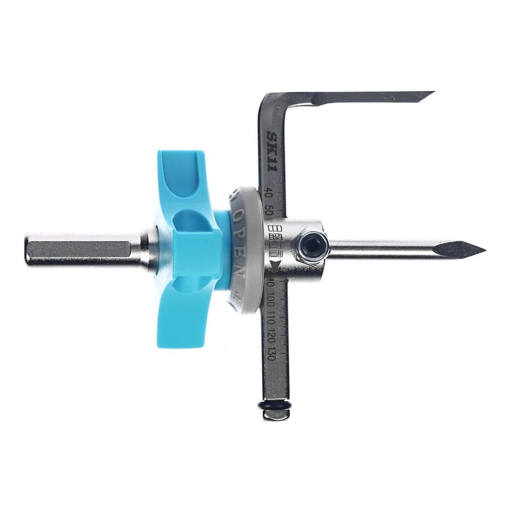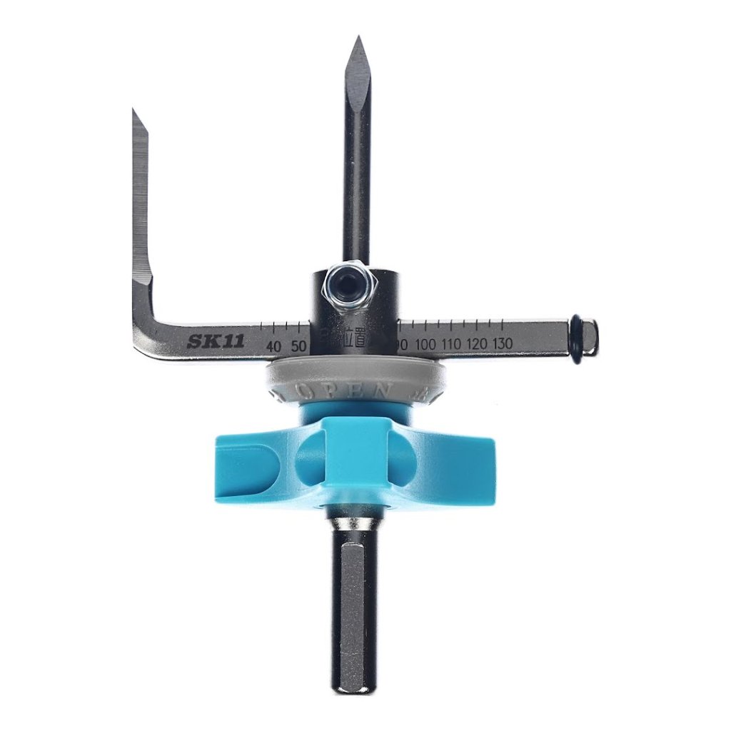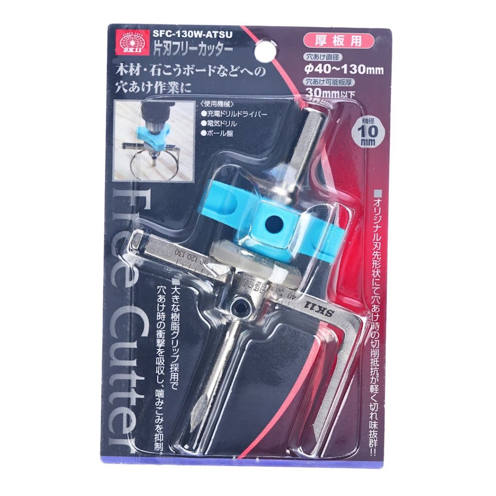 The SK11 Adjustable Circle Cutter, model SFC-130W-ATSU, is ideal for drilling holes in wood, plasterboard, plastic, and rubber. Its original blade shape reduces resistance during drilling, ensuring excellent sharpness. The large resin grip absorbs impact and minimizes jamming. In case of a lock, it can be quickly released with a wrench. It is suitable for cordless drills, electric drills, and drill presses. It can cut holes with diameters ranging from 40 to 130 mm in materials up to 30 mm thick.