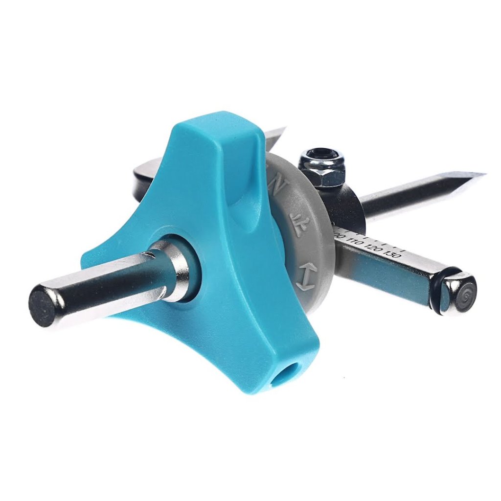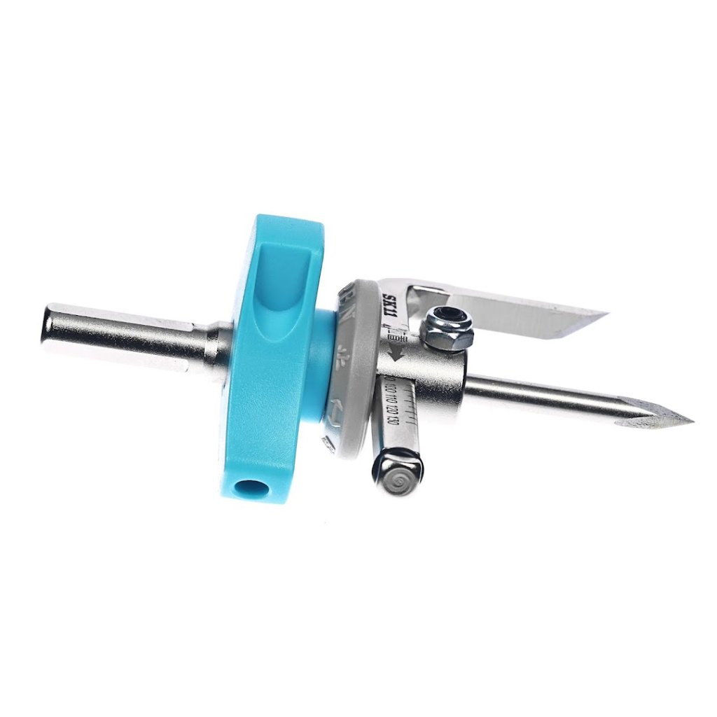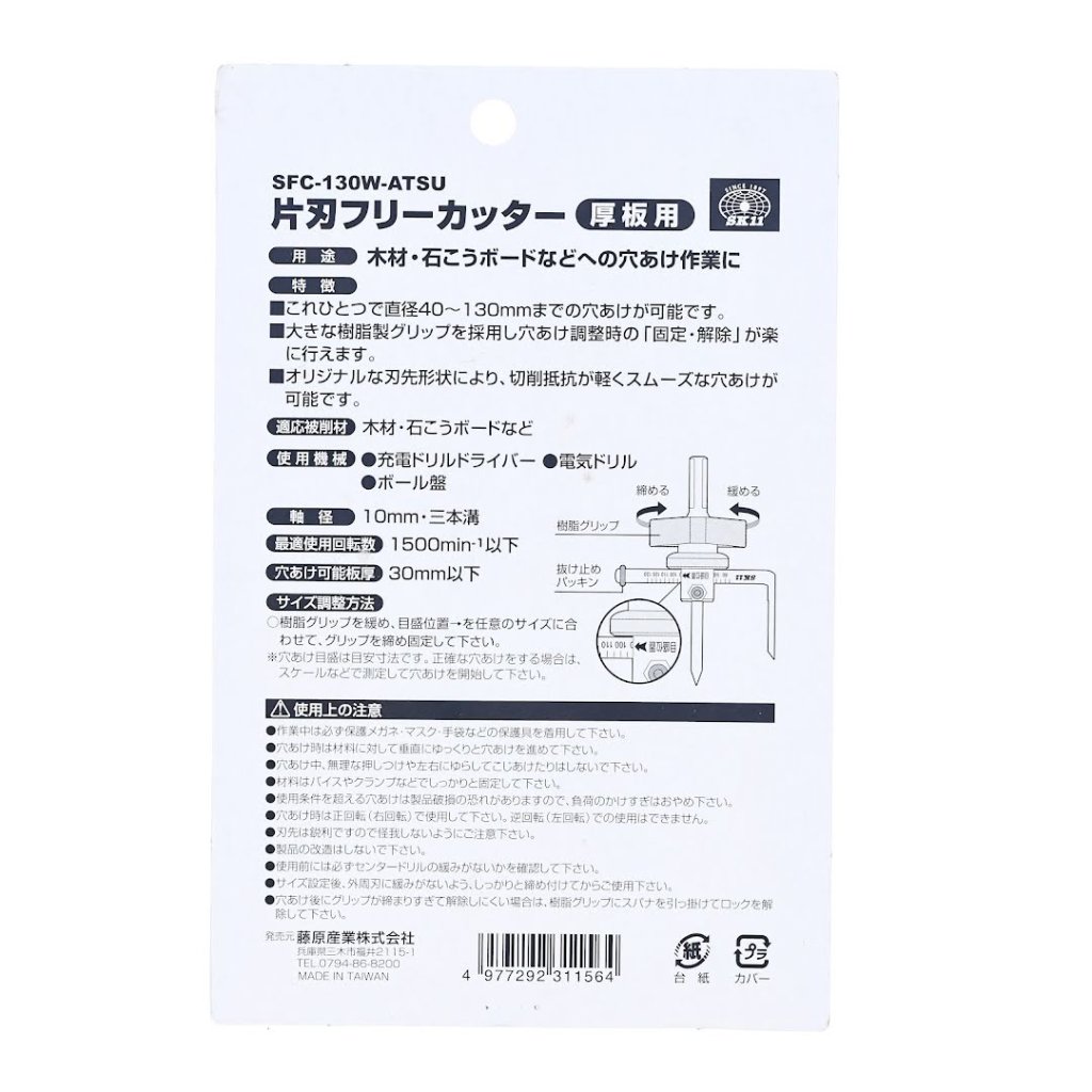 The SK11 Adjustable Circle Cutter, model SFC-130W-ATSU, is ideal for drilling holes in wood, plasterboard, plastic, and rubber. Its original blade shape reduces resistance during drilling, ensuring excellent sharpness. The large resin grip absorbs impact and minimizes jamming. In case of a lock, it can be quickly released with a wrench. It is suitable for cordless drills, electric drills, and drill presses. It can cut holes with diameters ranging from 40 to 130 mm in materials up to 30 mm thick.