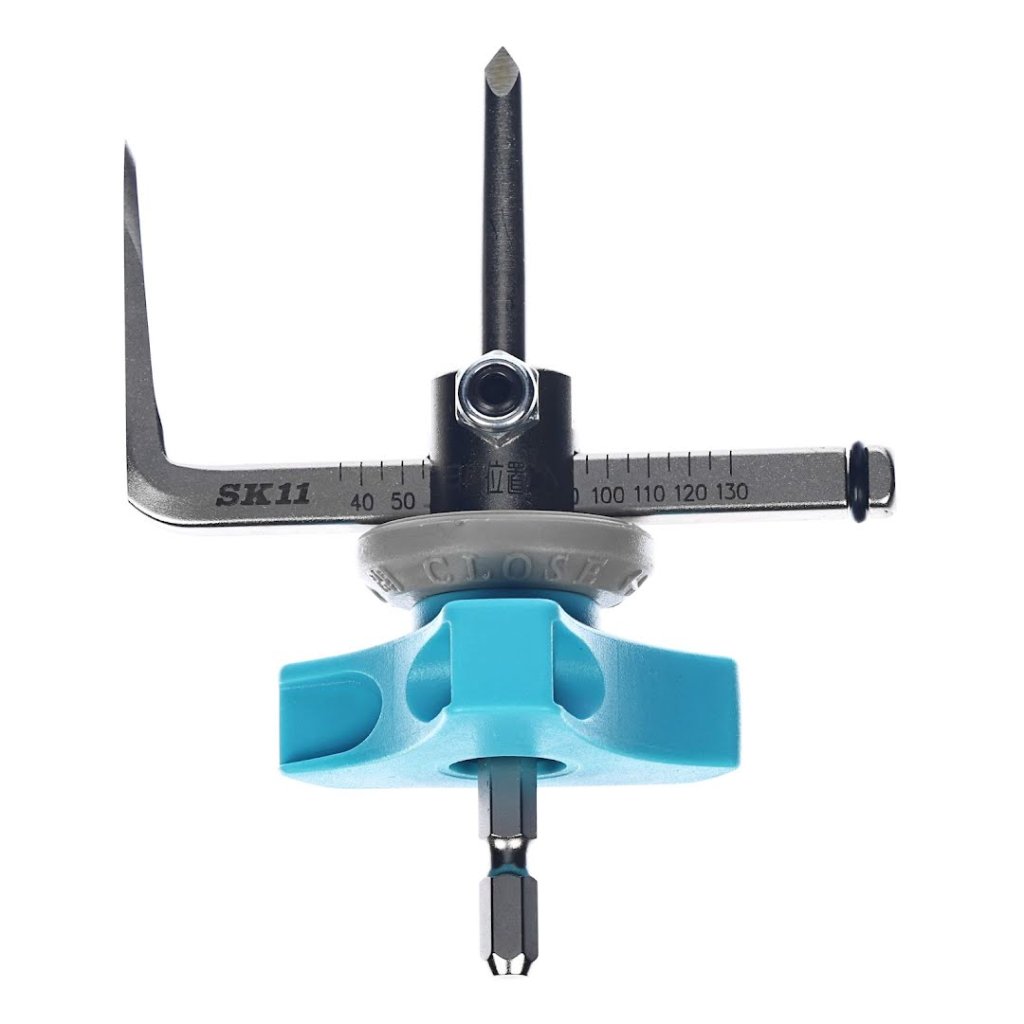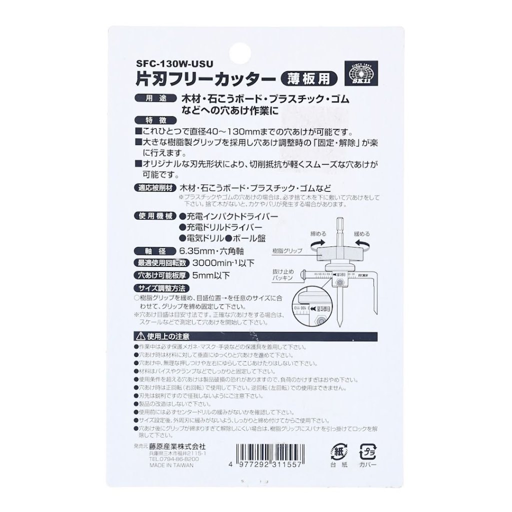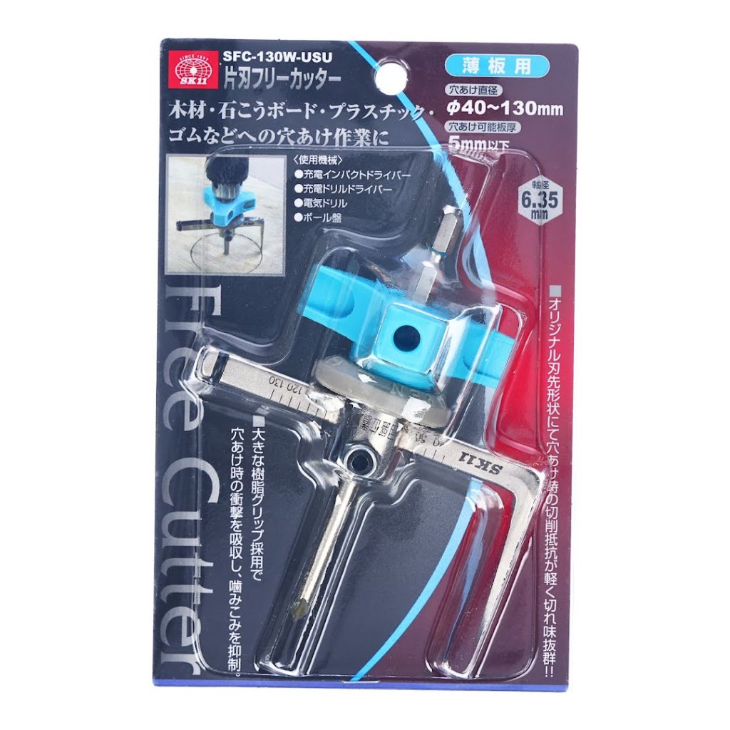 The SK11 Adjustable Circle Cutter, model SFC-130W-USU, is ideal for drilling holes in wood, plasterboard, plastic, and rubber. Its original blade design minimizes resistance, ensuring excellent cutting performance. The large resin grip absorbs impact and reduces jamming. In case of a lock-up, the shape allows for easy release with a wrench. Thanks to the 6.35 mm hex shank, it is suitable for cordless impact drivers, drill drivers, electric drills, and drill presses. It can cut holes with diameters ranging from 40 to 130 mm in materials up to 30 mm thick.