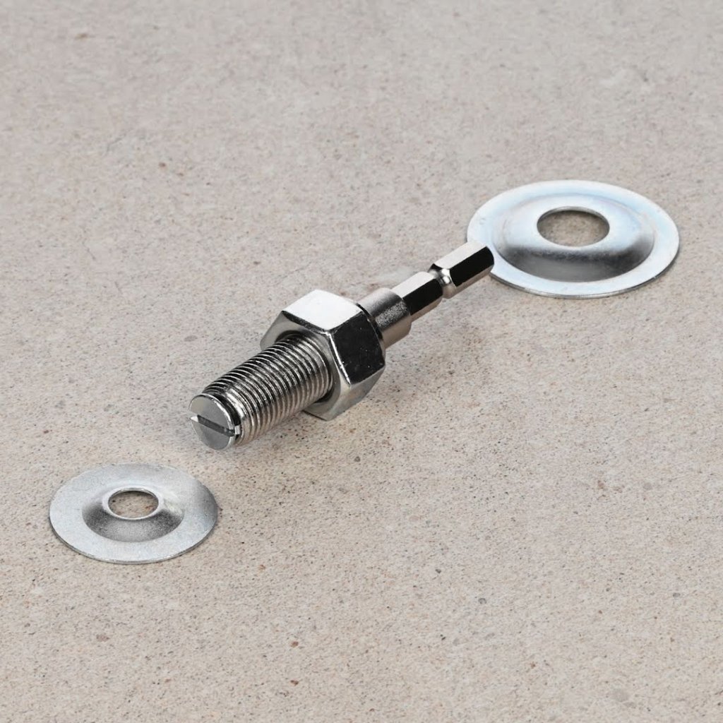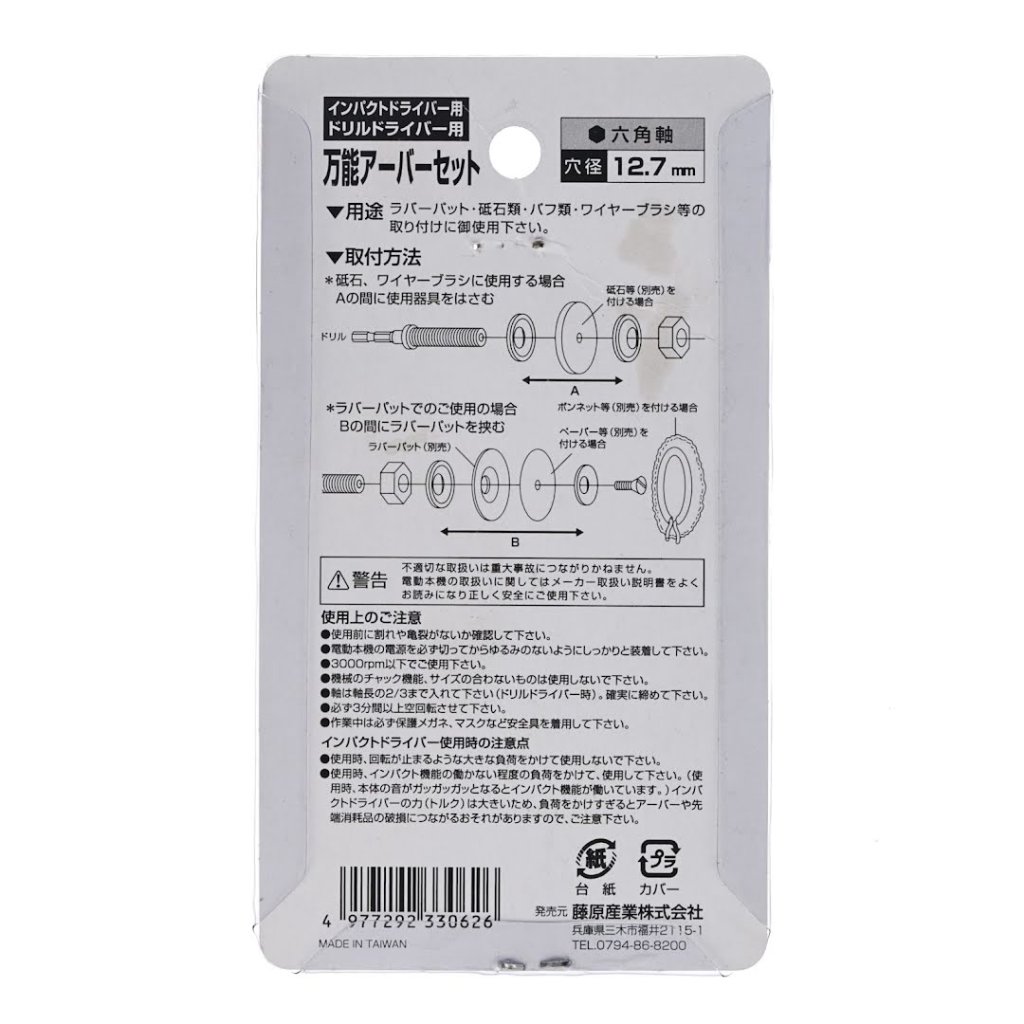 The SK11 Arbor Set is a versatile attachment for electric drills and impact drivers. It facilitates polishing and grinding tasks; it is perfect for mounting rubber pads, grinding wheels, buffs, and wire brushes. With a hex shank diameter of 6.35 mm and a hole diameter of 12.7 mm, this arbor supports a variety of tools, ensuring a secure fit for efficient work. For optimal performance, use at speeds below 3000 RPM.