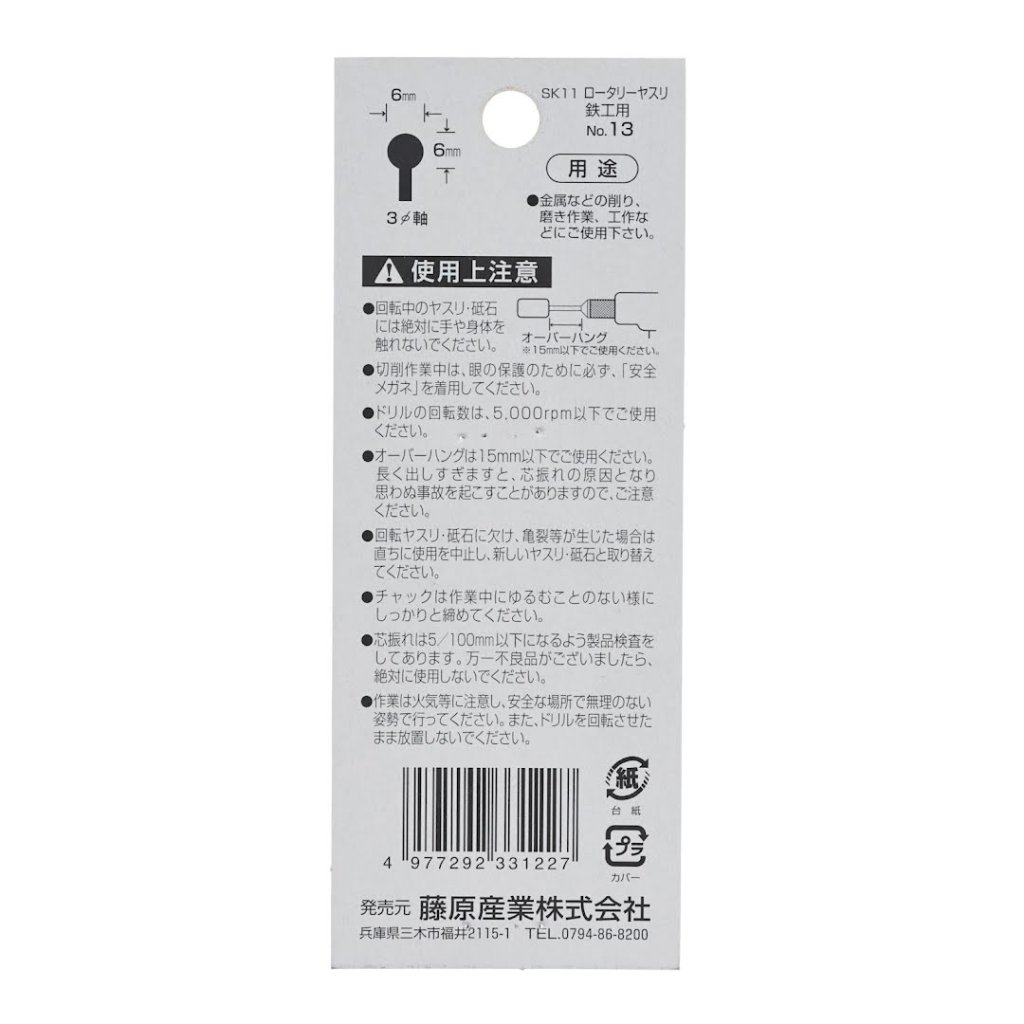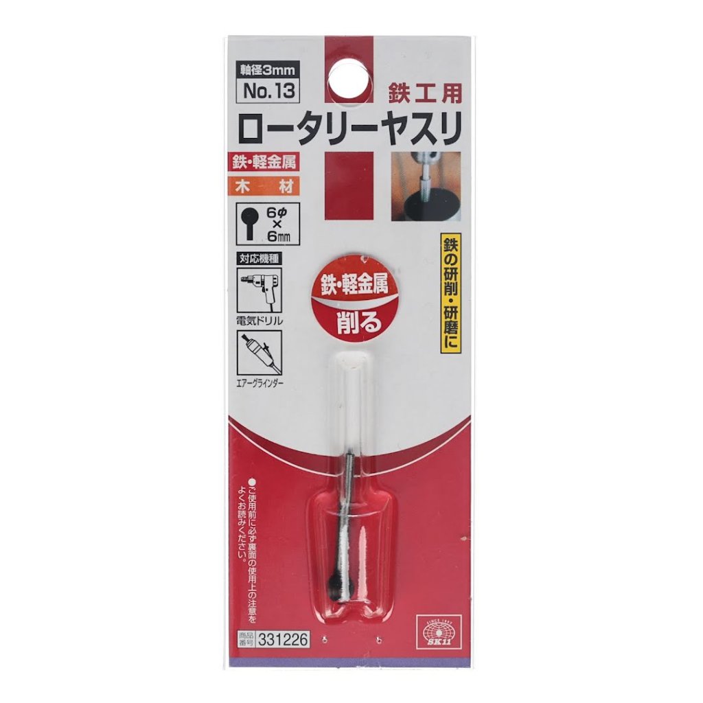 The SK11 Rotary Burr No.13 is for grinding and polishing tasks on iron, light metals, and wood. Its 3 mm shaft fits electric drills and air grinders. This burr features a 6 mm x 6 mm ball grinding head and requires a drill rotation speed of 5000 RPM or less.