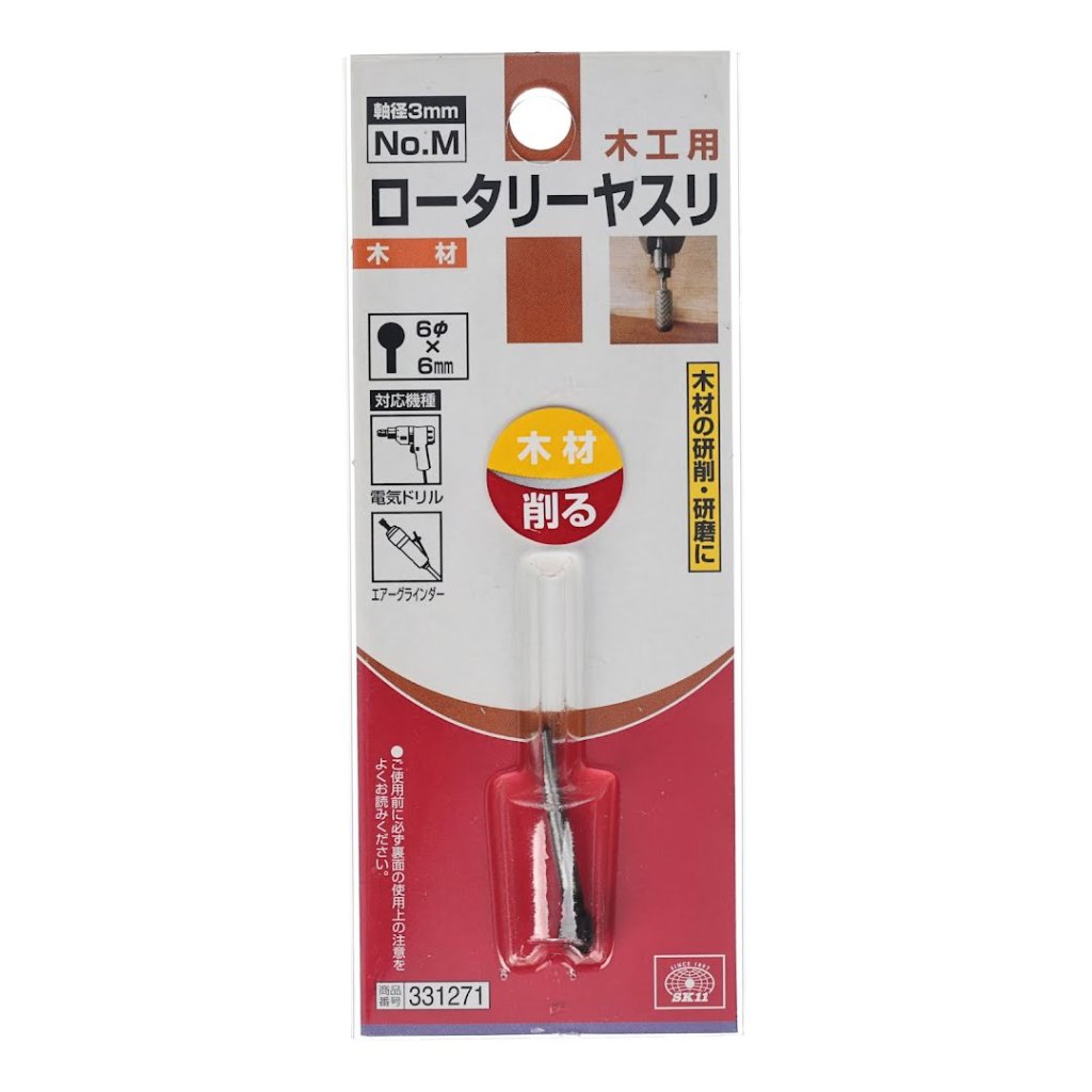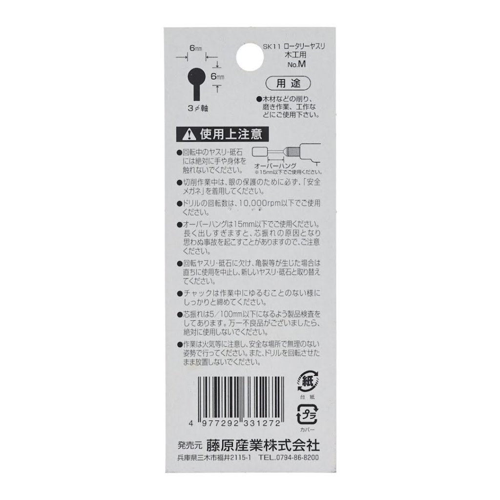 The SK11 Ball Shape Rotary Burr, model No.M, is ideal for shaping and polishing wood. This rotary file can be used with electric drills and air grinders. The burr features a shank diameter of 3 mm and a grinding stone size of 6 x 6 mm. For safe use, ensure the overhang does not exceed 15 mm and the drill speed remains under 10000 RPM.