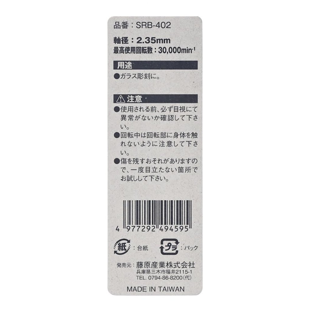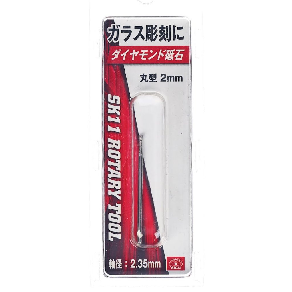 The SK11 Diamond Coated Rotary Burr, model SRB-402, is perfect for glass engraving and bird carving. The 2 mm ball shape and diamond coating ensure precision in grinding various work materials. The burr features a 2.35 mm shank and a permissible rotation speed of 30000 RPM.