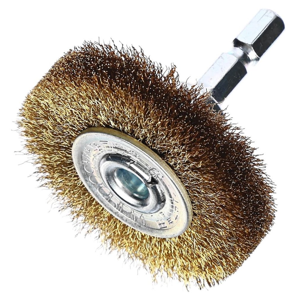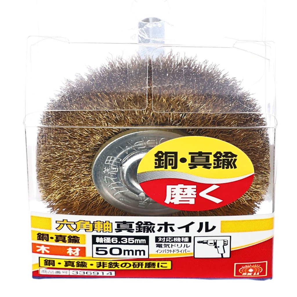 The SK11 Brass Wire Wheel Brush is designed for surface polishing and cleaning materials such as copper, brass, and wood. Its convenient 50 mm diameter and 6 mm round shaft make it perfect in tight spaces and corners. Its soft wire bristles ensure that the workpiece is not damaged during use. This brush is versatile and efficient for various tasks and compatible with electric drills, flexible shafts, and air drills.