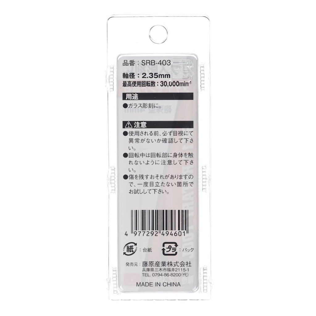 The SK11 Diamond Coated Rotary Burr, model SRB-403, is ideal for glass engraving and bird carving. This tool features a 4 mm bullet-shaped head and a 2.35 mm shank, suitable for various grinding applications. The maximum allowable rotational speed of 30000 RPM ensures efficient performance.