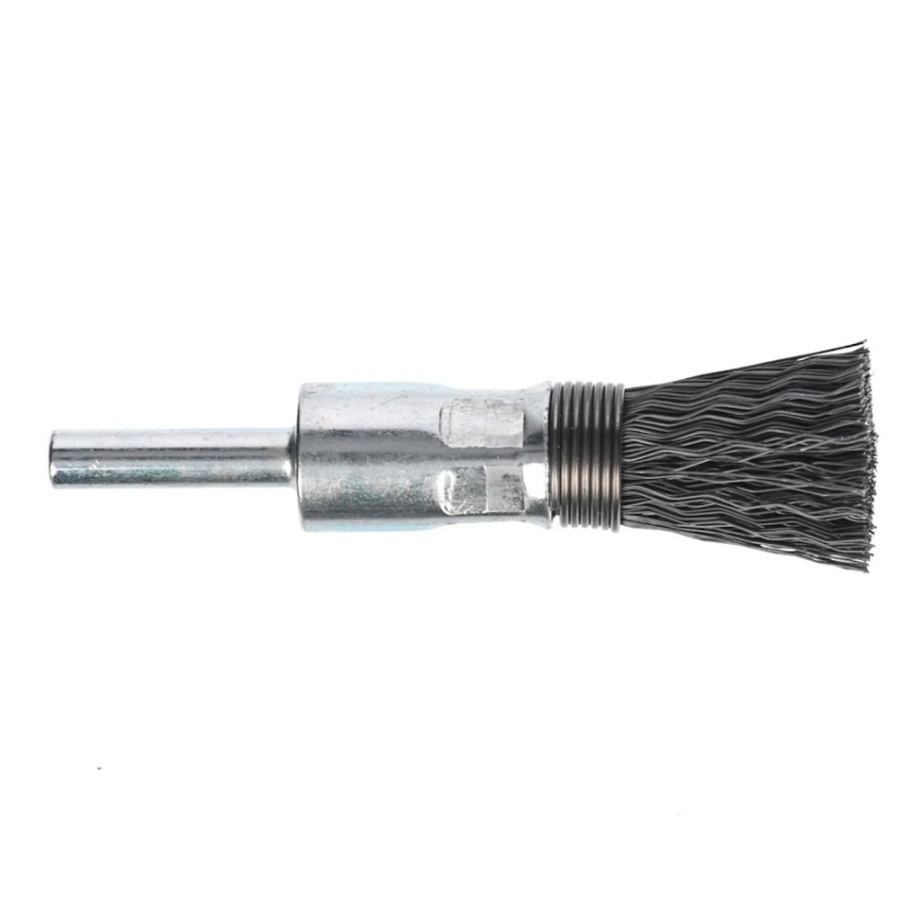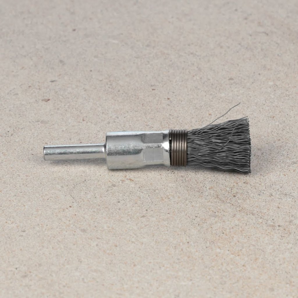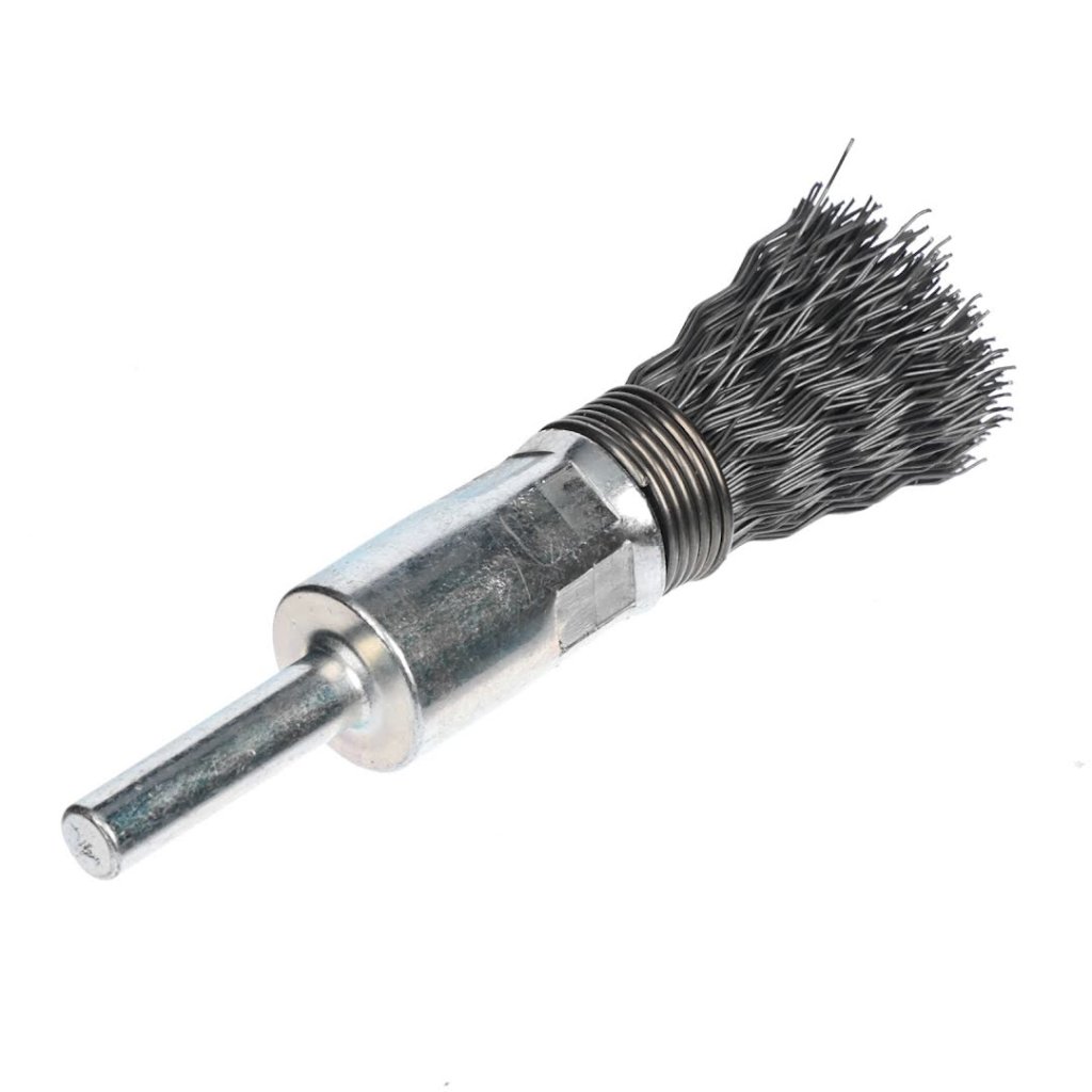 The SK11 Crimped Wire End Brush is perfect for removing rust, paint stripping, and deburring tasks on iron, light metals, and wood. With a diameter of approximately 15 mm and a 6 mm shank, it fits electric drills, flexible shafts, and air drills. Ideal for cleaning and polishing inside pipes and tight corners, this brush also excels in finishing irregular wood and roots.