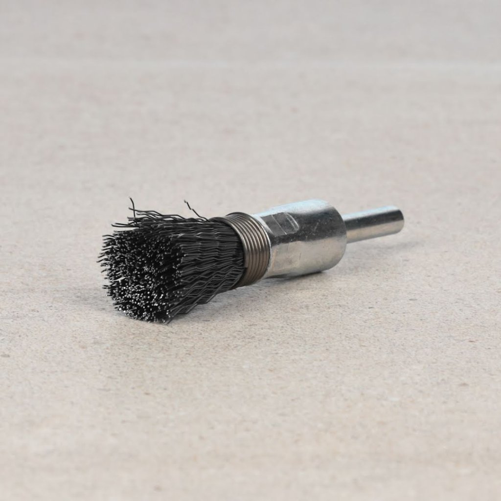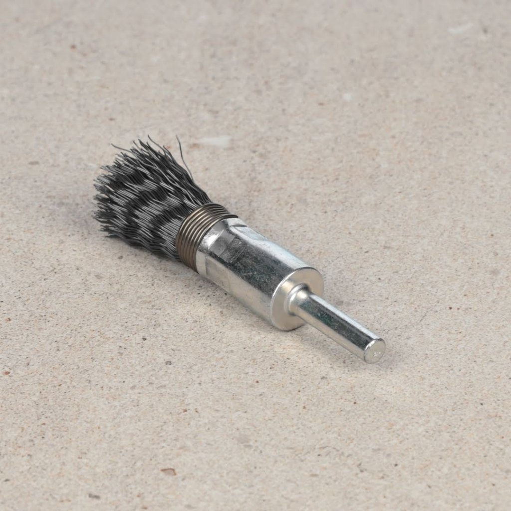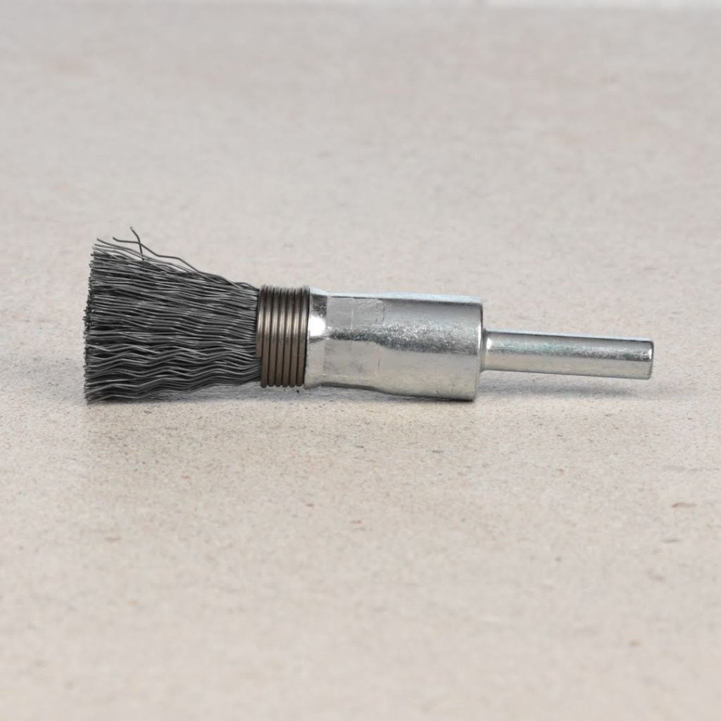 The SK11 Crimped Wire End Brush is perfect for removing rust, paint stripping, and deburring tasks on iron, light metals, and wood. With a diameter of approximately 15 mm and a 6 mm shank, it fits electric drills, flexible shafts, and air drills. Ideal for cleaning and polishing inside pipes and tight corners, this brush also excels in finishing irregular wood and roots.