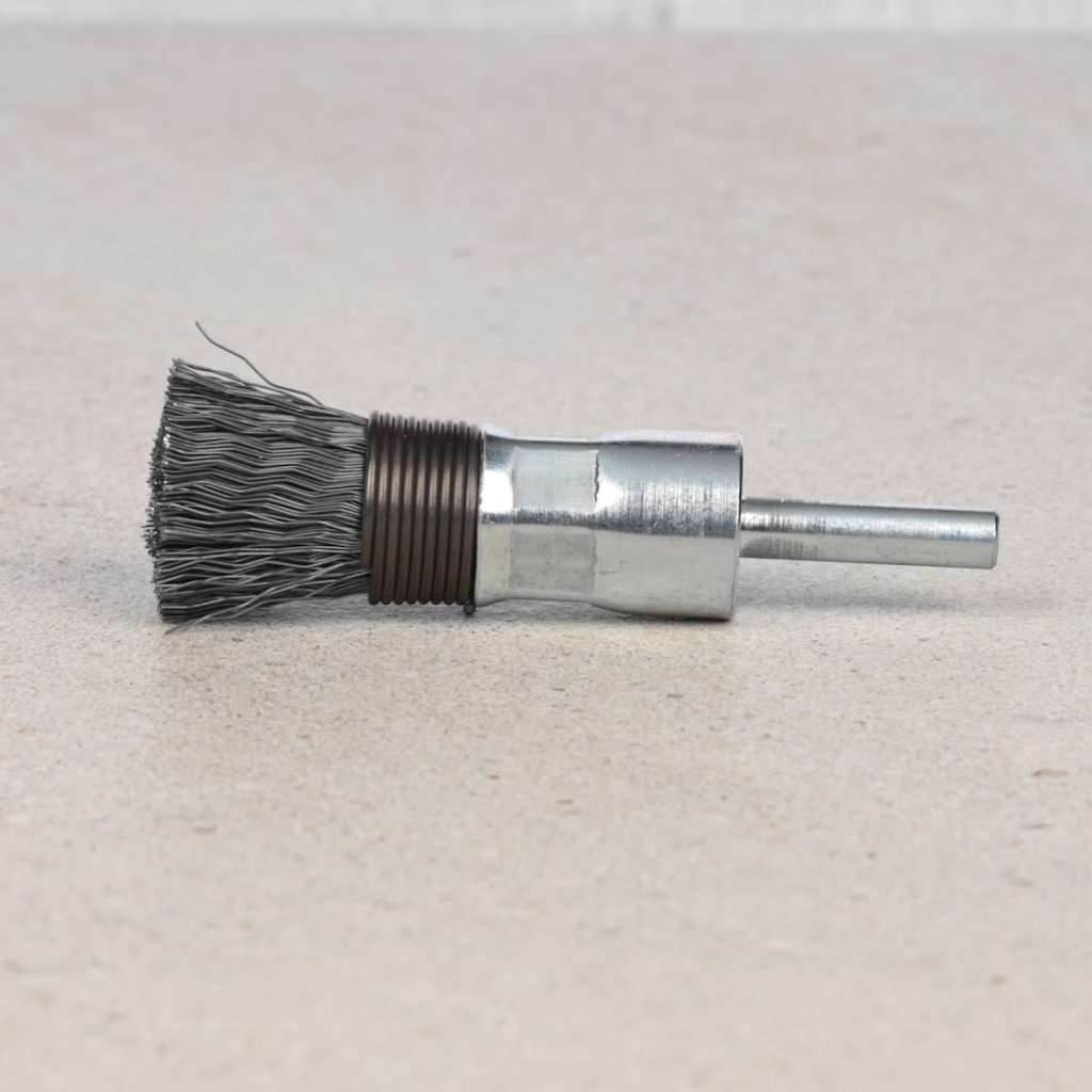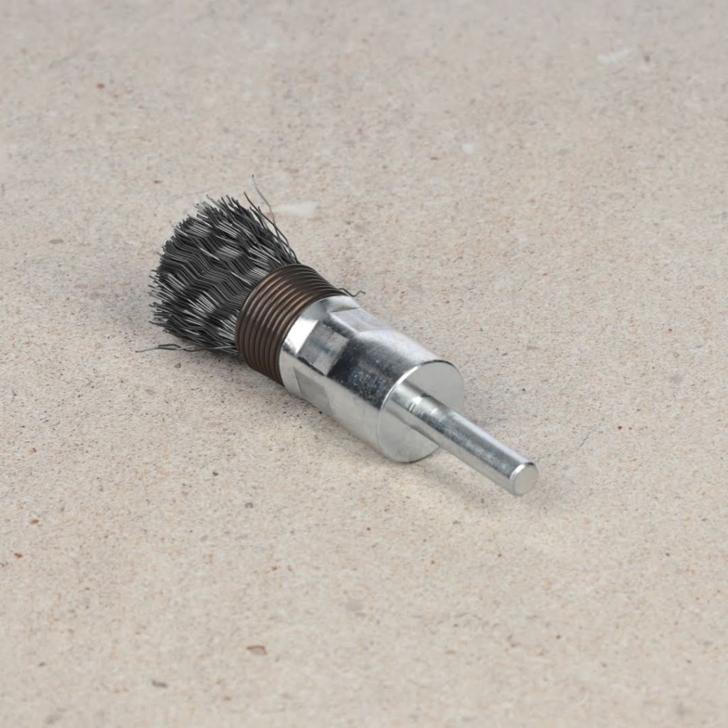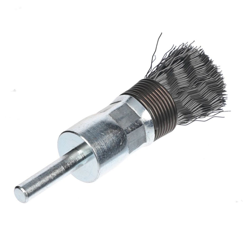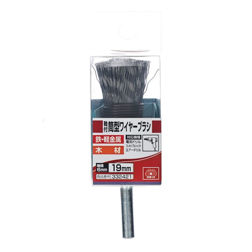This Crimped Wire End Brush by SK11 is designed for removing rust, paint stripping, and deburring on iron, light metals, and wood. Measuring 19 mm in diameter, it is ideal for cleaning and polishing pipes and other narrow or corner areas. Compatible with electric drills, flexible shafts, and air drills, its 6 mm shaft diameter ensures versatile use.