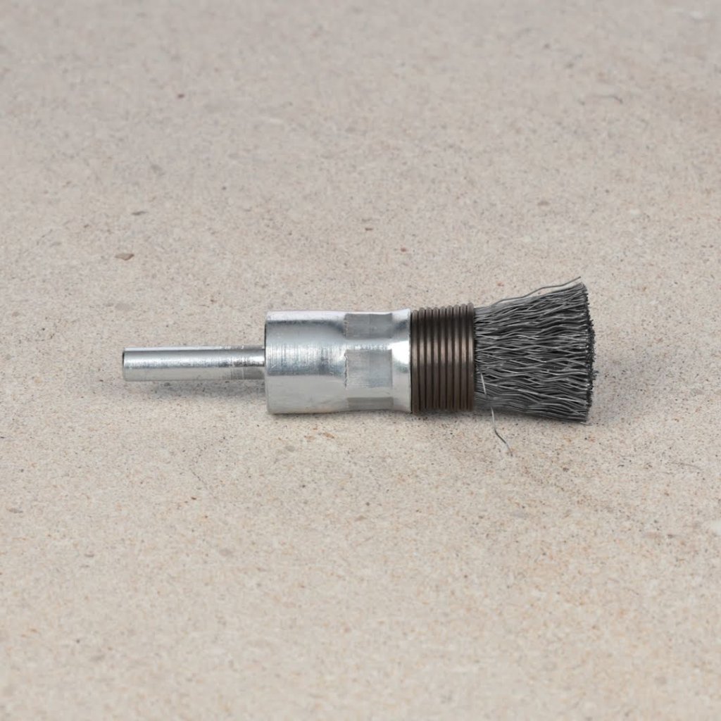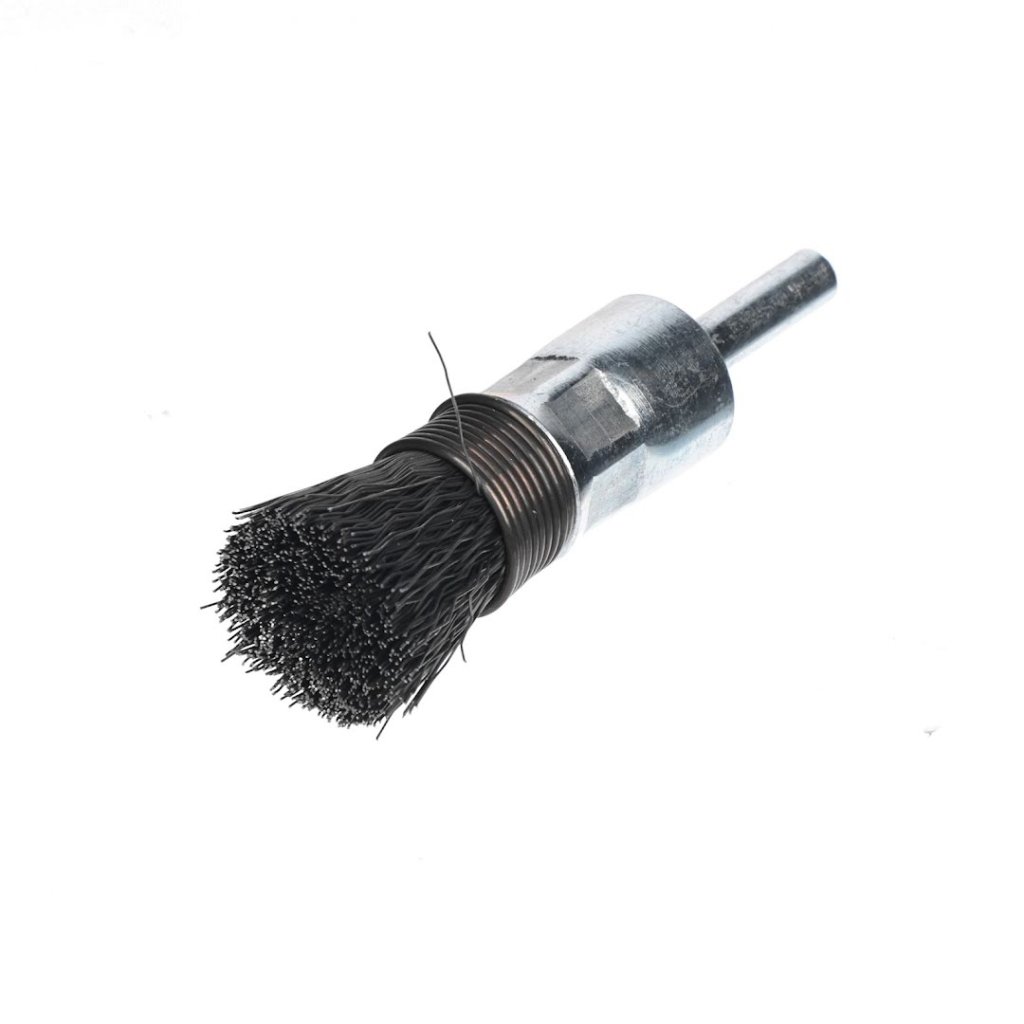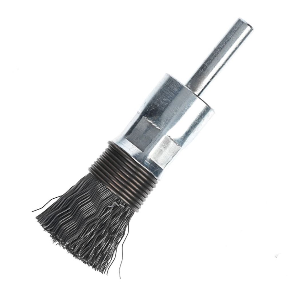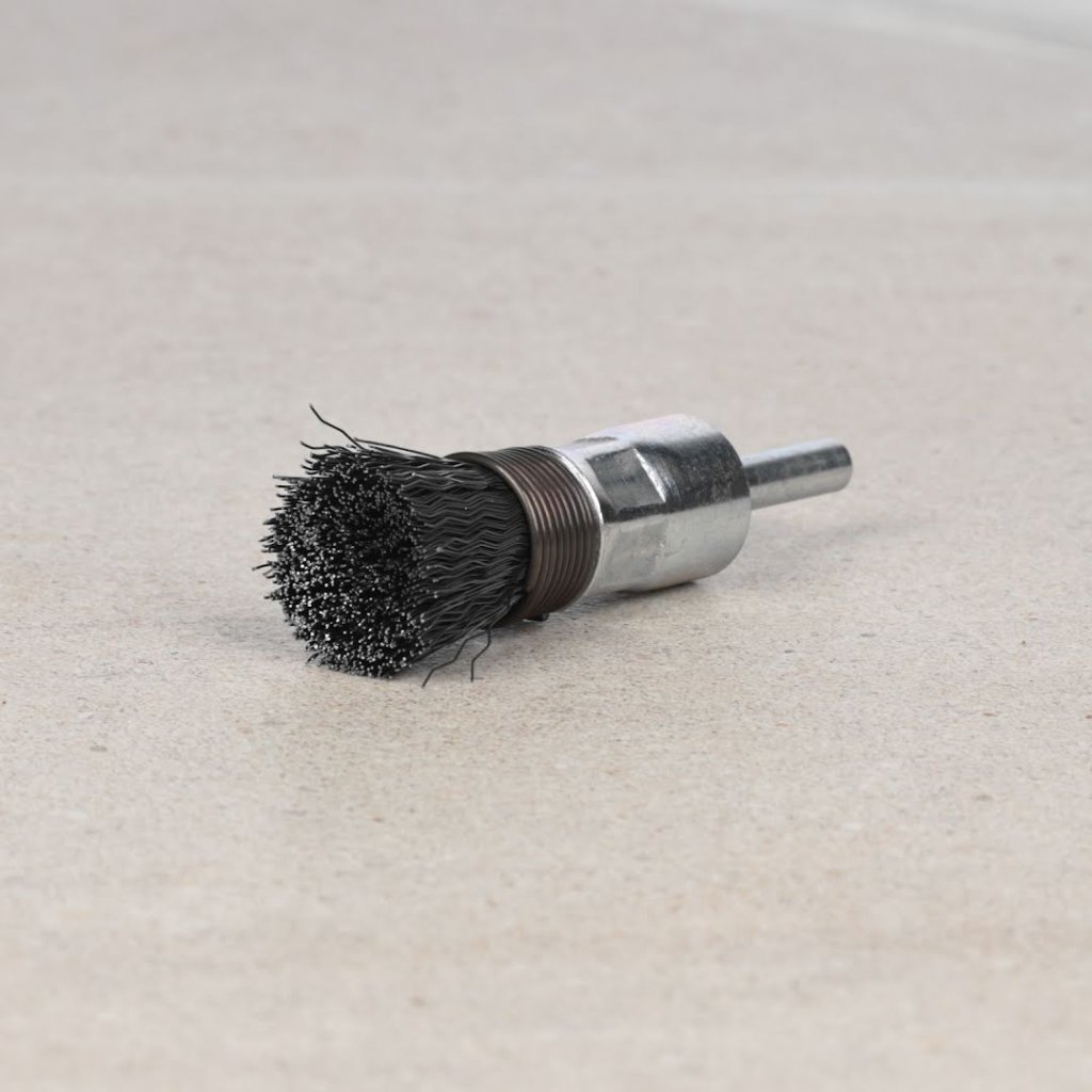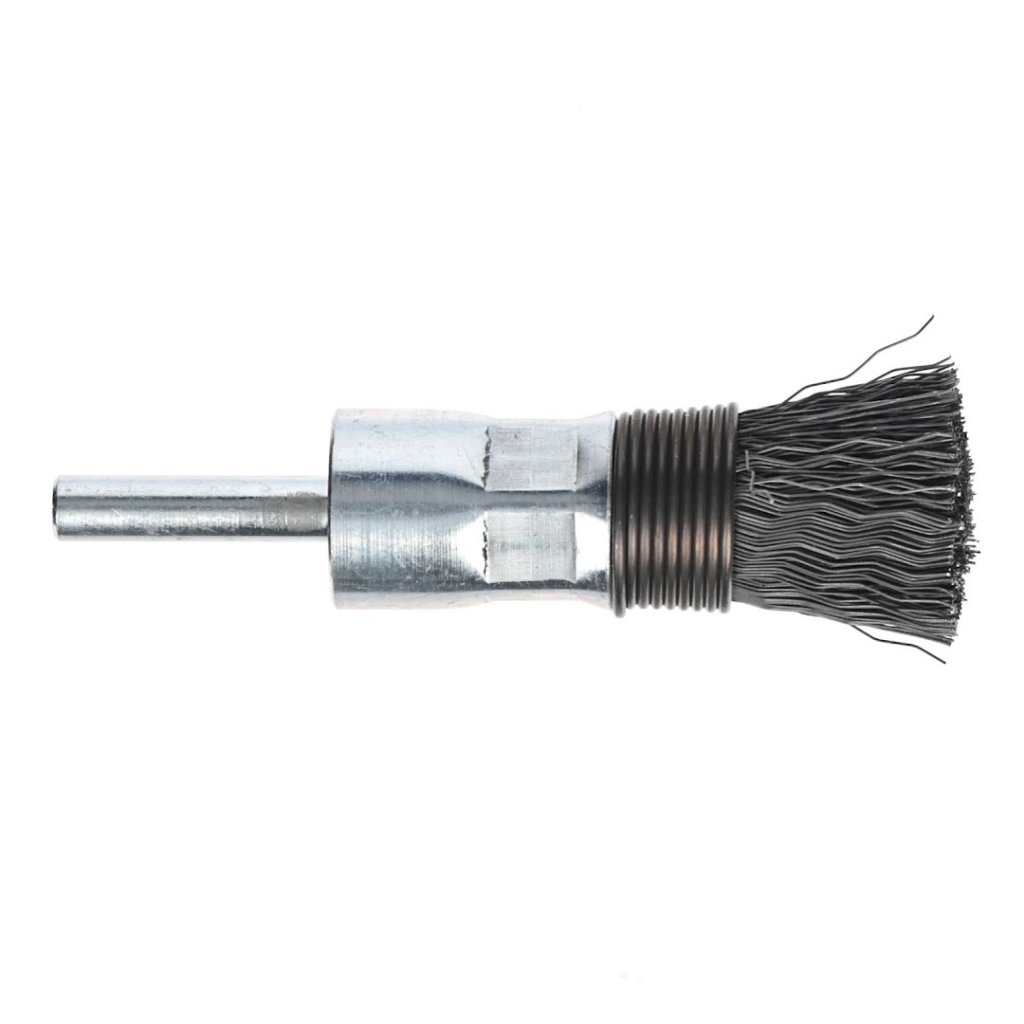 This Crimped Wire End Brush by SK11 is designed for removing rust, paint stripping, and deburring on iron, light metals, and wood. Measuring 19 mm in diameter, it is ideal for cleaning and polishing pipes and other narrow or corner areas. Compatible with electric drills, flexible shafts, and air drills, its 6 mm shaft diameter ensures versatile use.