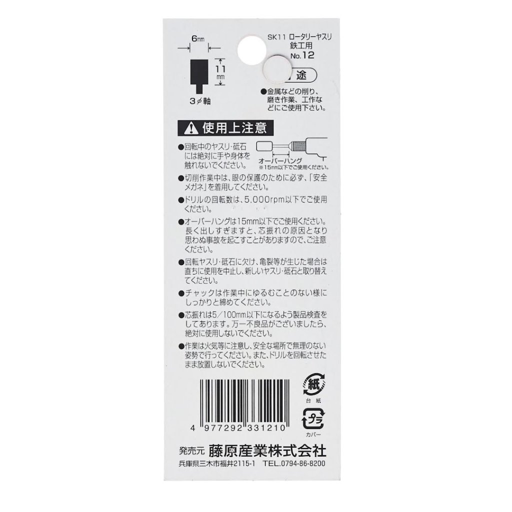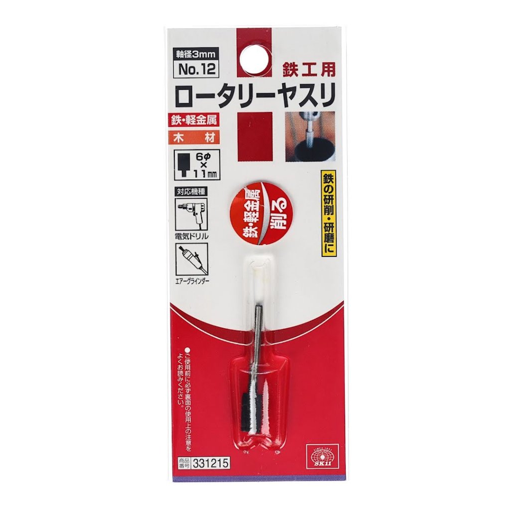 The SK11 Cylinder Rotary Burr No.12 is ideal for grinding and polishing tasks on various materials, including iron, light metals, and wood. Designed for use with electric drills and air grinders, this tool features a 3 mm shank diameter and a 6 mm wide grinding stone. The burr measures 35 mm in height and weighs 20 g. For optimal performance, ensure the drill's rotation speed remains below 5000 RPM.