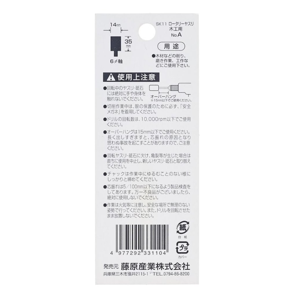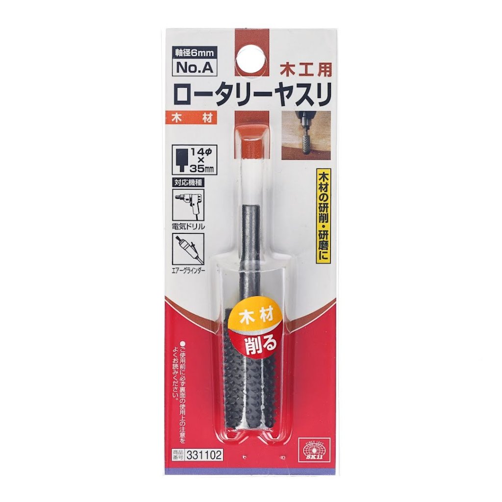The SK11 Cylinder Rotary Burr, model No.A, is ideal for shaping and polishing wood and other crafting projects. Designed for use with electric drills and air grinders, this burr features a 6 mm shank and 14 x 35 mm grinding surface. Ensure safe operation by keeping the overhang under 15 mm and the drill speed below 10000 RPM.
