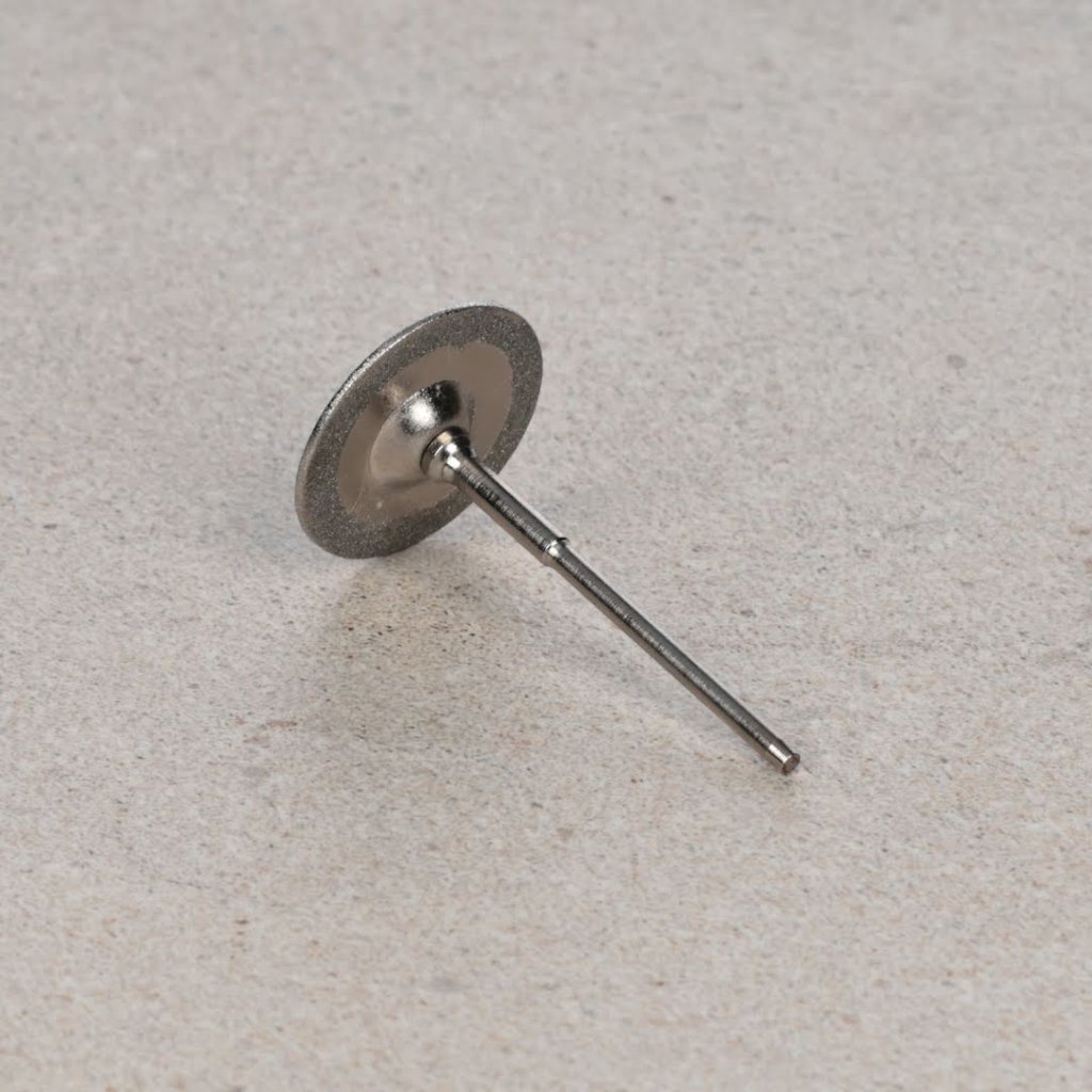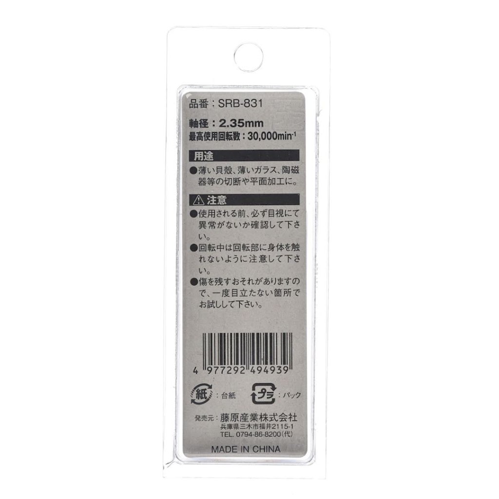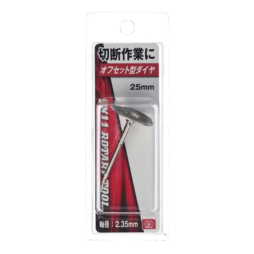 The SK11 Depressed Center Diamond Grinding Wheel, model SRB-831, is ideal for cutting and surface processing thin shells, glass, and ceramics. Its offset design makes it easy to handle areas that are challenging for traditional disc cutters. The wheel measures 25 mm in diameter with a 2.35 mm shank and supports a maximum rotational speed of 30000 RPM.