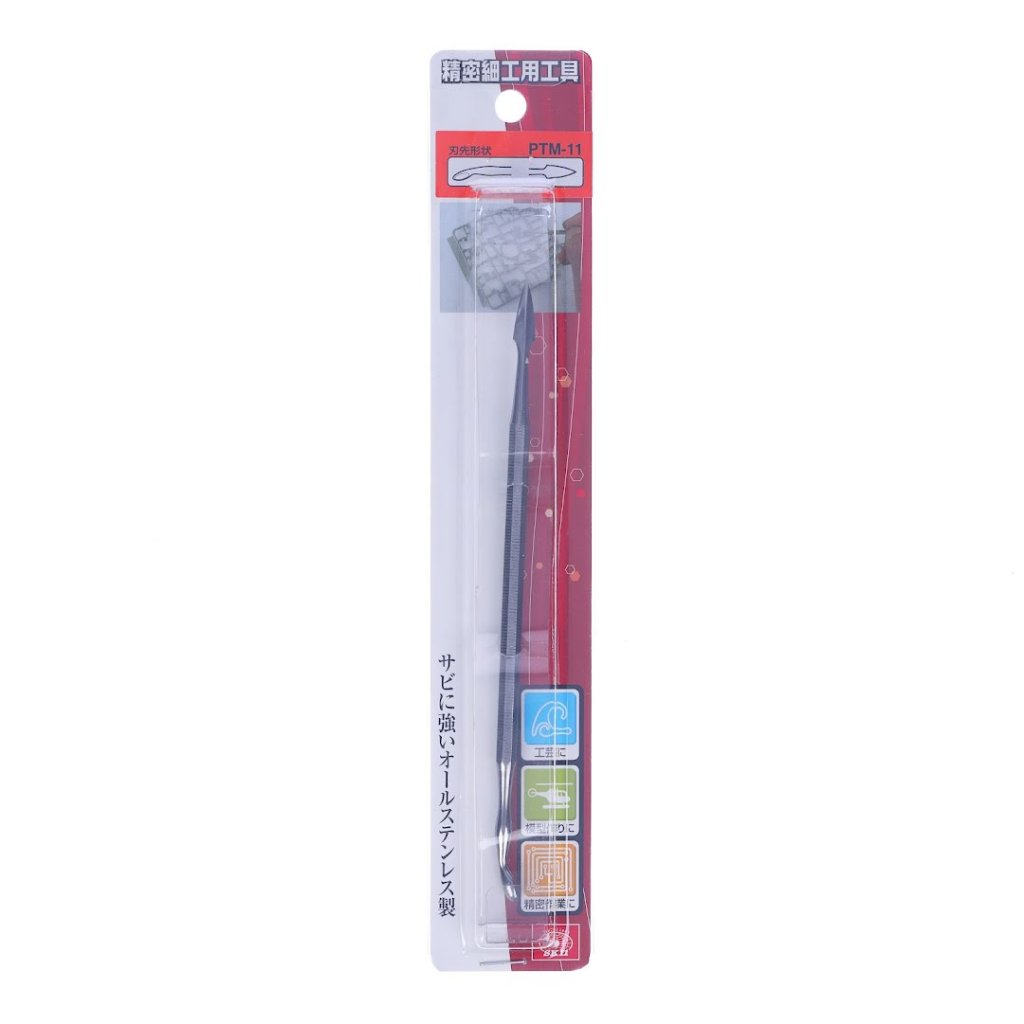 The SK11 Double End Precision Tool, model PTM-11, features a spoon tip and spear tip designed for intricate tasks such as sculpting, clay modeling, and decorative work. Crafted from all stainless steel for durability and resistance to rust, this tool measures 9 mm in width, 157 mm in height, and 6 mm in depth, weighing just 20 g. Ideal for use in fine arts and crafts, including pottery, woodworking, and metalworking, it's essential for anyone requiring precision.