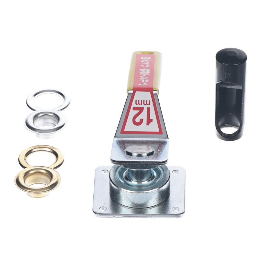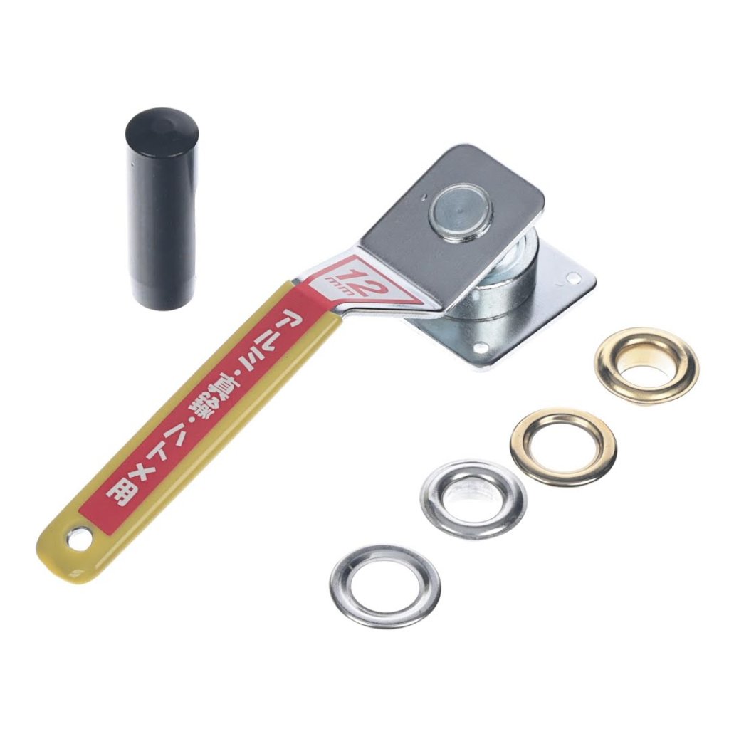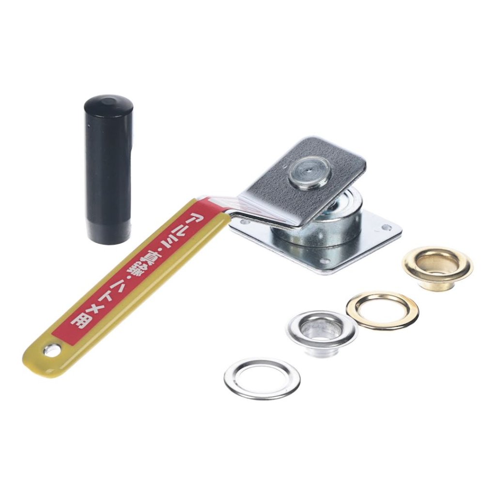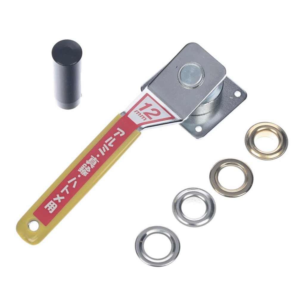 The SK11 Double-Sided Grommet Punch, model No.1300, is a versatile tool designed for reinforcing and repairing holes in tents, sheets, and more. This set is perfect for various applications with a 12.0 mm eyelet diameter and a maximum attachment thickness of 3.5 mm. The brass eyelets are durable and robust, ideal for heavy-duty items. In contrast, the aluminum eyelets are easily attached and rust-resistant, making them suitable for aprons and bookbinding. The set ensures a clean and sturdy finish that extends the lifespan of your items.