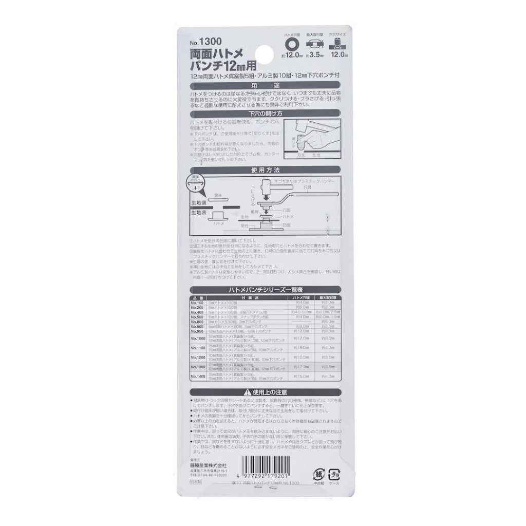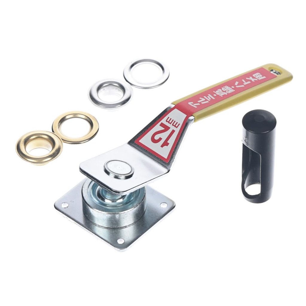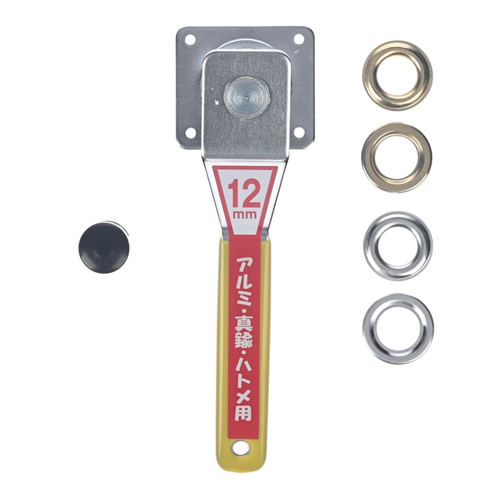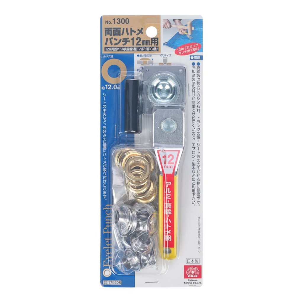 The SK11 Double-Sided Grommet Punch, model No.1300, is a versatile tool designed for reinforcing and repairing holes in tents, sheets, and more. This set is perfect for various applications with a 12.0 mm eyelet diameter and a maximum attachment thickness of 3.5 mm. The brass eyelets are durable and robust, ideal for heavy-duty items. In contrast, the aluminum eyelets are easily attached and rust-resistant, making them suitable for aprons and bookbinding. The set ensures a clean and sturdy finish that extends the lifespan of your items.