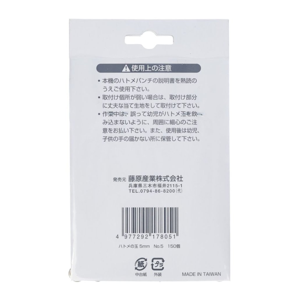The SK11 Eyelets, model No.5, are designed to repair and reinforce holes in materials such as cardstock, fabric, vinyl, and leather. With a size of 7 x 7 x 3 mm and weighing 20 g, these eyelets are compatible with SK11 Eyelet Pliers (No.100, No.400, and No.500), making them highly versatile. Each pack contains 150 pieces, ideal for various projects. They feature an eyelet hole diameter of approximately 4.0 mm, a maximum attachment thickness of about 2.0 mm, and require a pre-hole size of 5.0 mm.