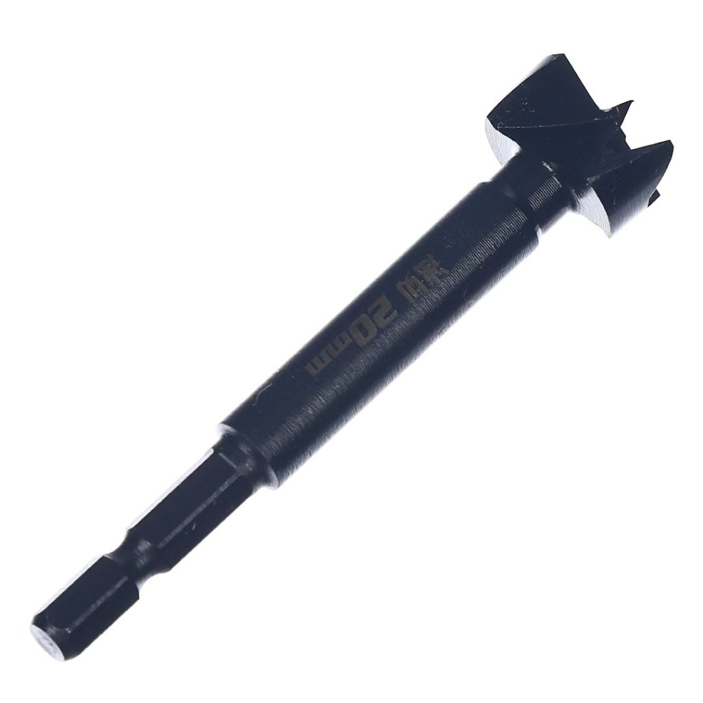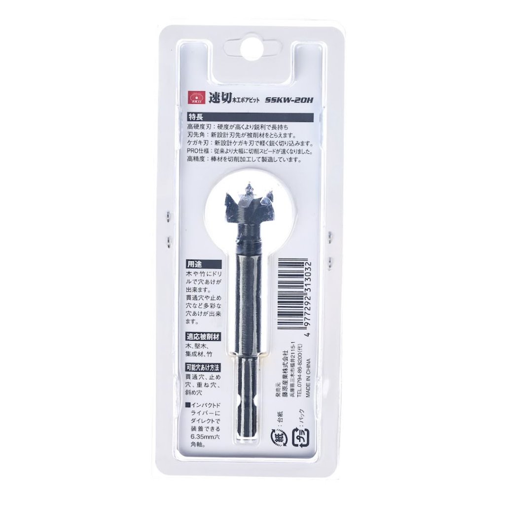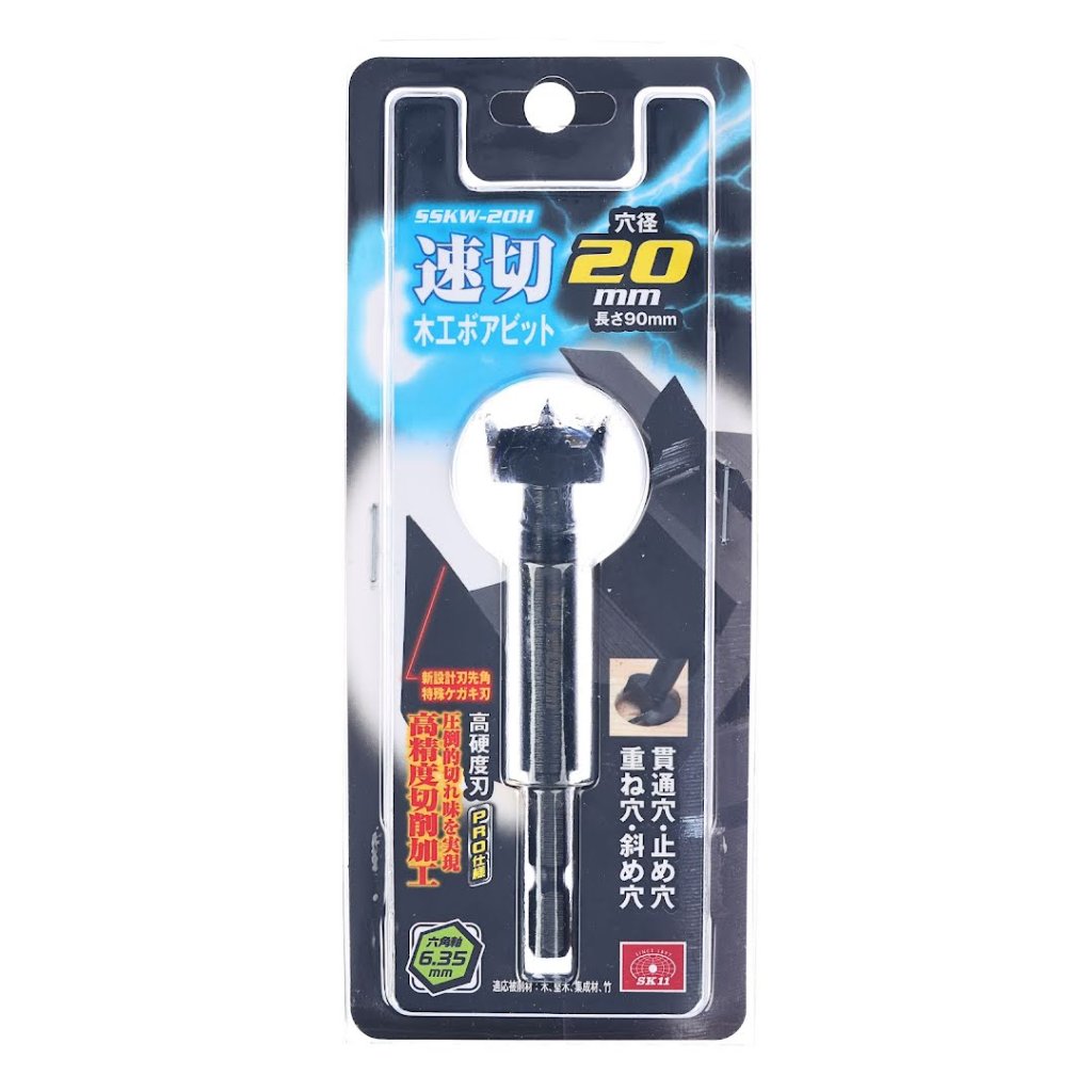 The SK11 Fast Cutting Forstner Bit, model SSKW-20H, features a 6.35 mm hex shank for easy attachment to impact drivers, making it perfect for drilling through wood, hardwood, laminated wood, and bamboo. Its one-piece forged construction ensures durability, while the high-hardness blade provides superior cutting performance. With an overall length of 90 mm and a hole diameter of 20 mm, this bit easily creates through holes, stop holes, overlapping holes, and angled holes.