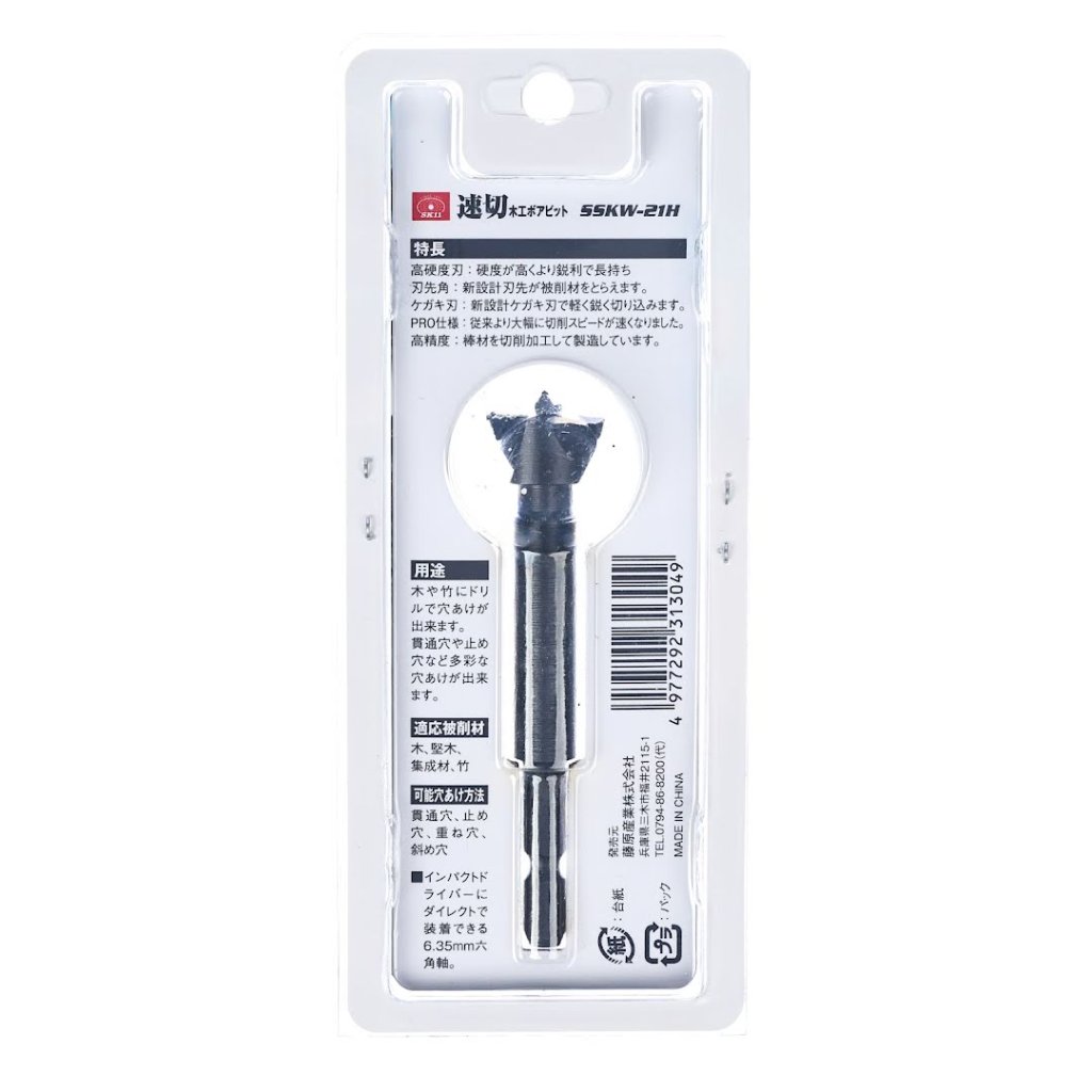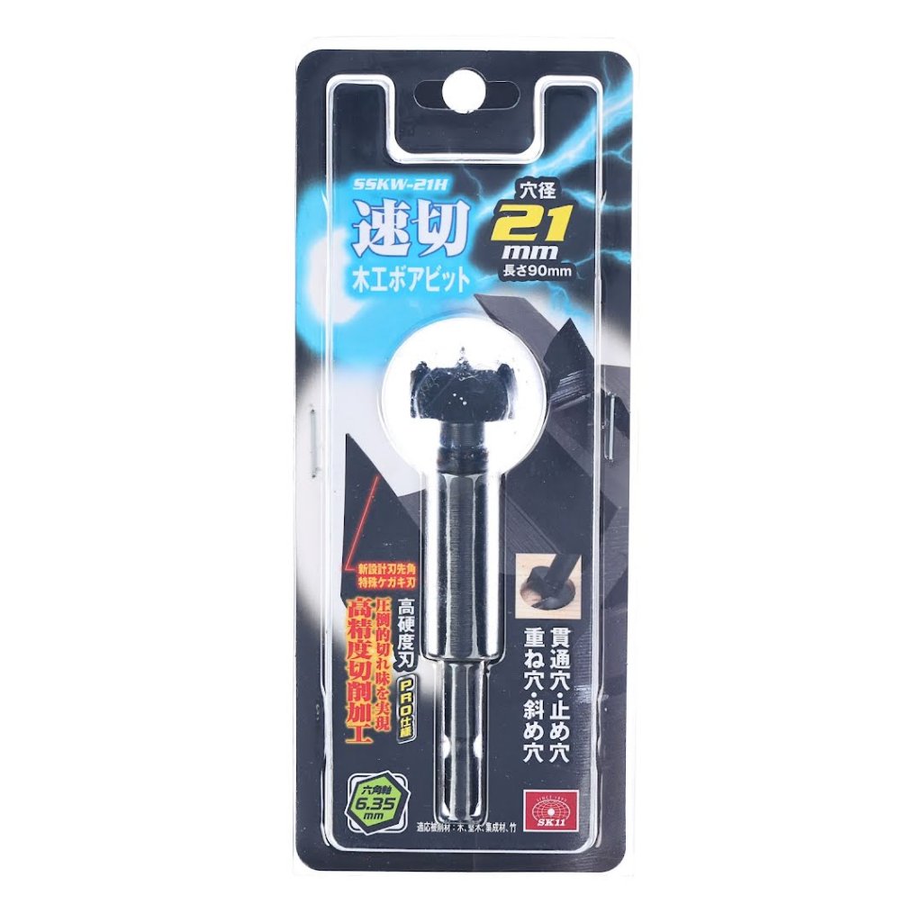 The SK11 Fast Cutting Forstner Bit, model SSKW-21, is designed for precise and efficient drilling in wood, hardwood, laminated wood, and bamboo. Featuring a one-piece forged construction and a 21 mm diameter, this bit ensures durability and longevity. The 6.35 mm hex shank allows easy attachment to impact drivers, making it a versatile addition to your toolkit. Capable of creating through holes, blind holes, overlapping holes, and angled holes, it provides superior sharpness and cutting ease.
