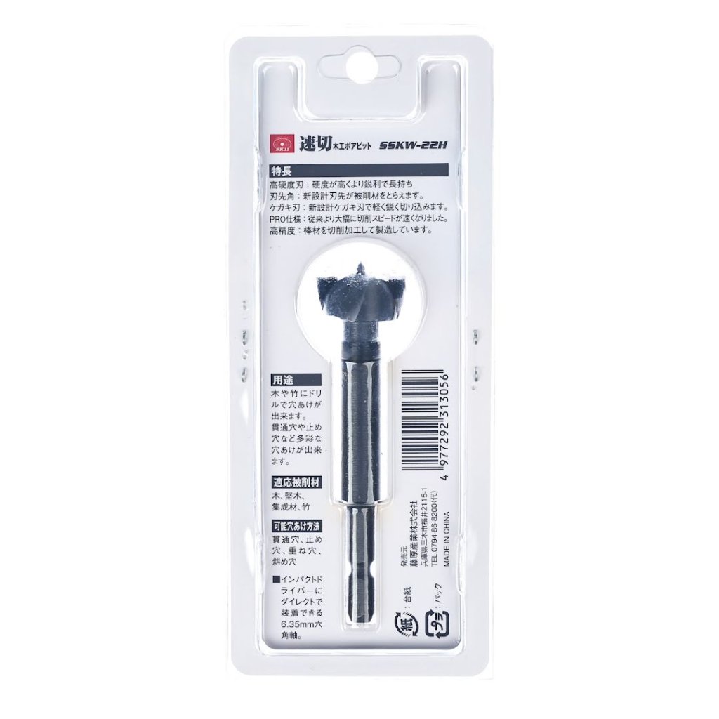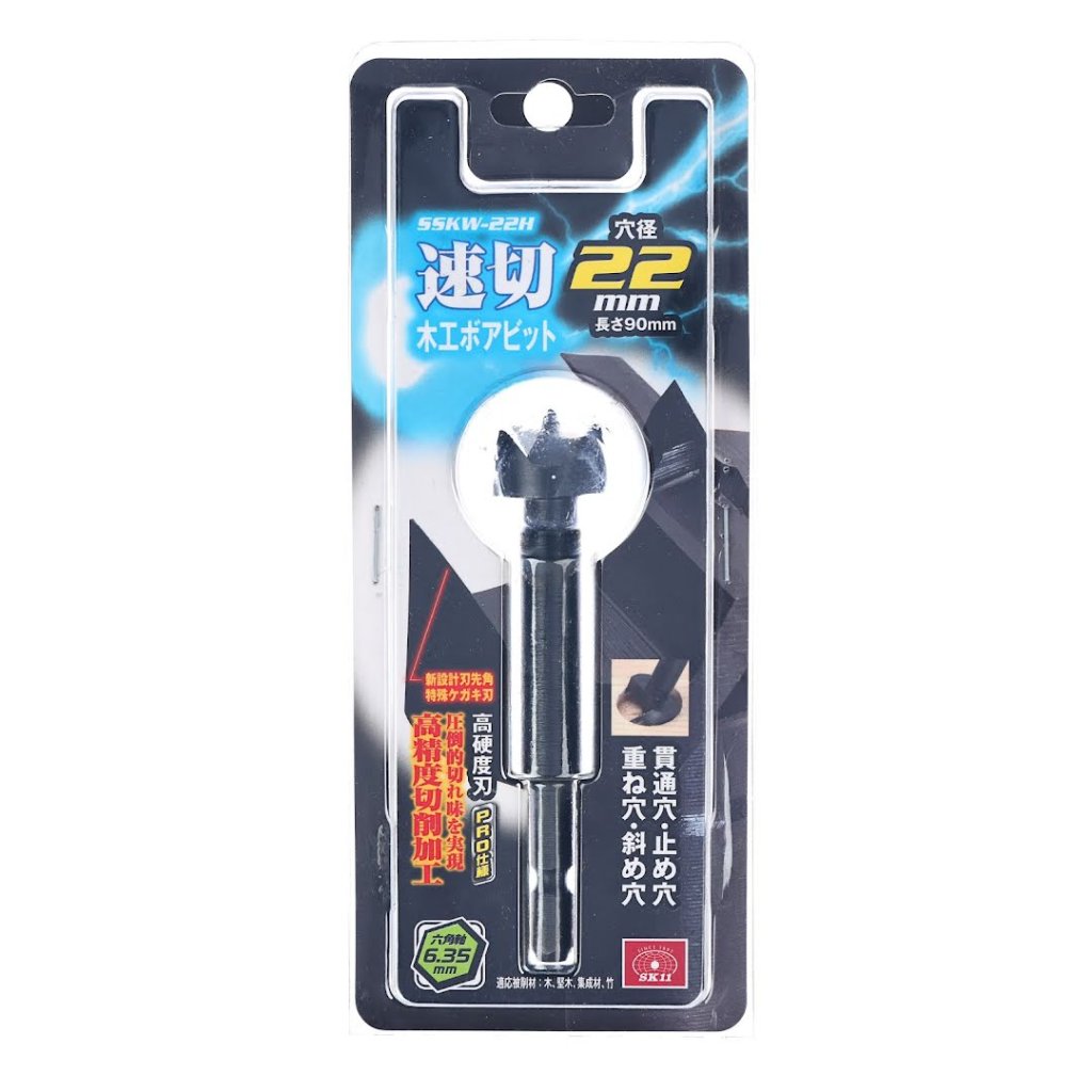 The SK11 Fast Cutting Forstner Bit, model SSKW-22H, is designed for speedy and precise drilling in wood, hardwood, plywood, and bamboo. This bit features a 22 mm diameter and is made with one-piece forged construction for durability. The 6.35 mm hex shank allows direct attachment to impact drivers, making it convenient for various drilling tasks, including through holes, stopped holes, and angled holes.
