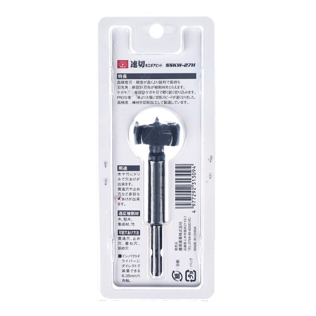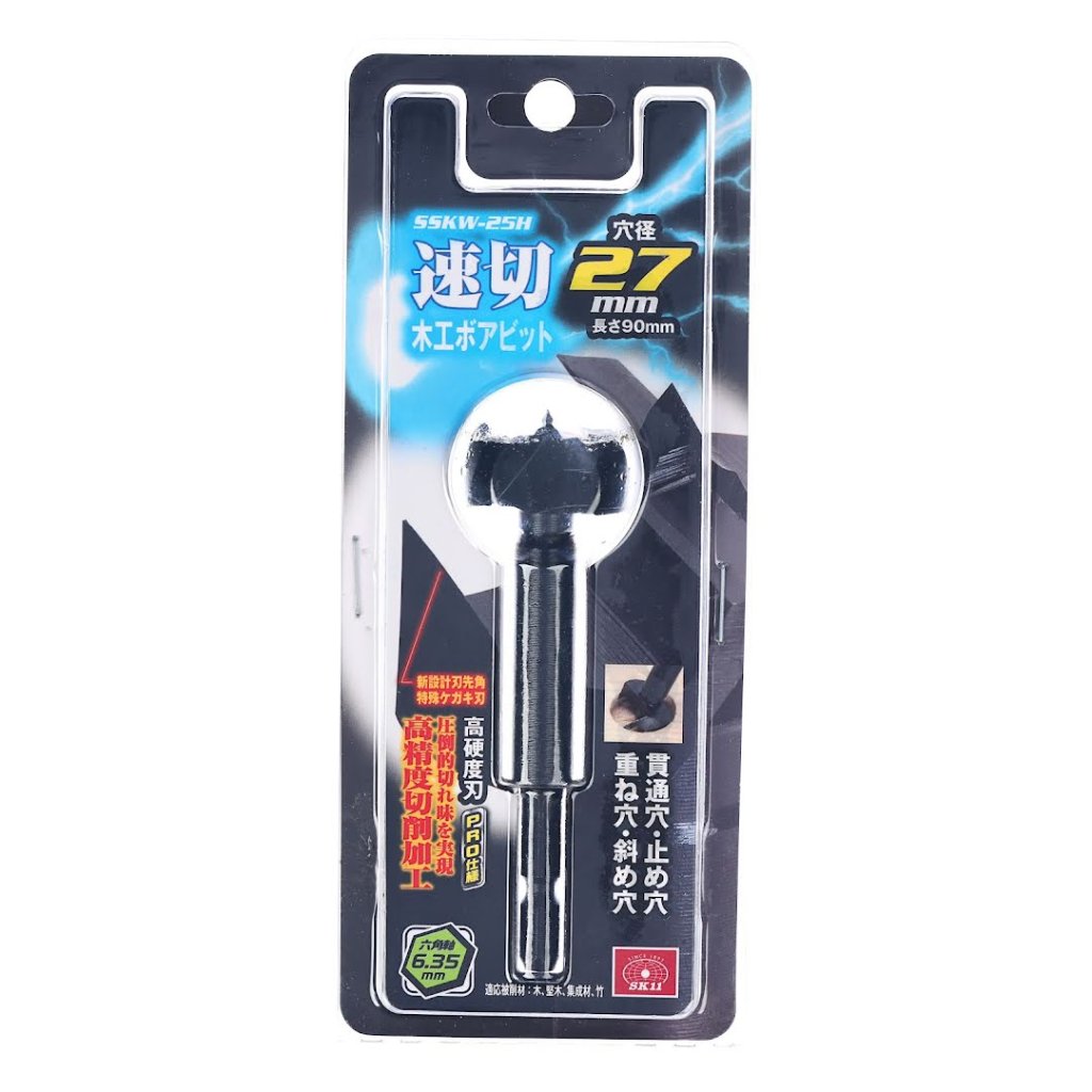 The SK11 Fast Cutting Forstner Bit, model SSKW-27H, is expertly designed for fast and precise drilling in wood, hardwood, composite materials, and bamboo. It features a 6.35 mm hex shank and can be directly attached to an impact driver. The bit's high-hardness blade ensures sharp and efficient cutting, while the special scoring blade allows for clean and smooth entry. With a diameter of 27 mm and a total length of 90 mm, this bit is perfect for creating through holes, blind holes, pocket holes, and angled holes.