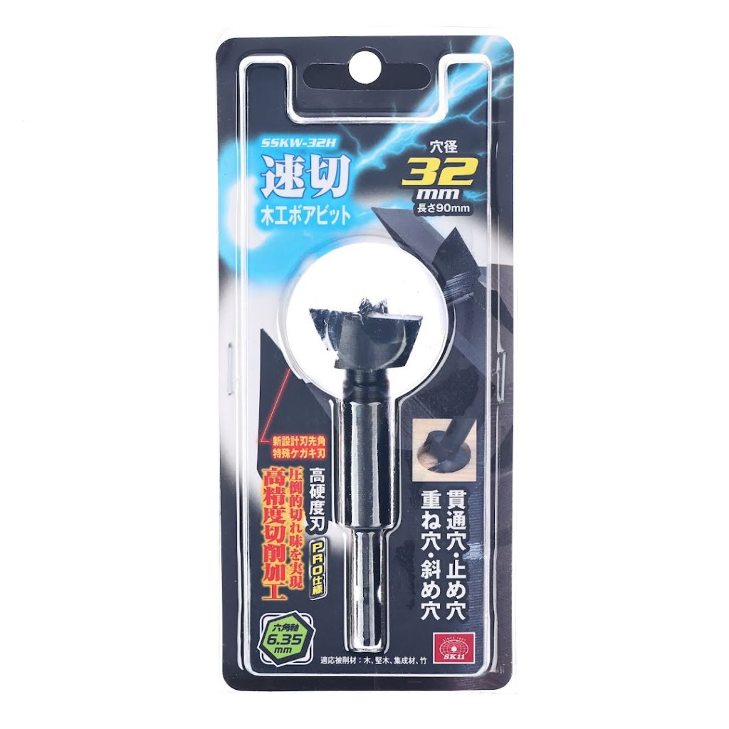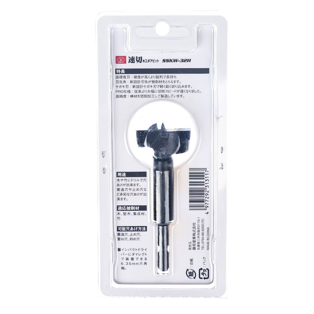 The SK11 Fast Cutting Forstner Bit, model SSKW-32H, is designed for precise and efficient drilling in various materials, including wood, hardwood, plywood, and bamboo. It features a 32 mm diameter and a 6.35 mm hex shank. It can be directly attached to an impact driver for enhanced usability. The bit features a one-piece, forged construction, and a high-hardness blade for superior sharpness and durability, allowing for easy drilling of through holes, blind holes, overlapping holes, and angled holes.