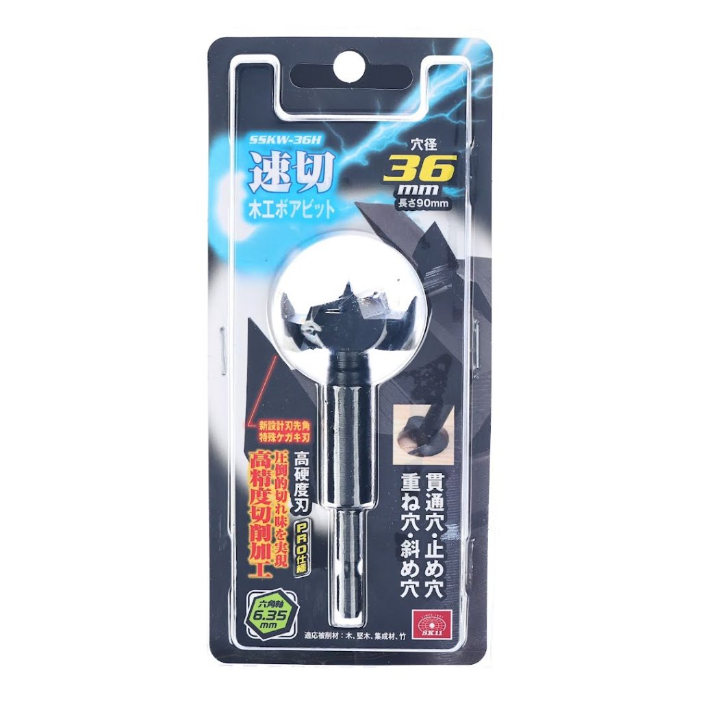 The SK11 Fast Cutting Forstner Bit, model SSKW-36H, is designed for speedy and precise drilling in wood, hardwood, laminated wood, and bamboo. This bit features a 6.35 mm hex shank for direct attachment to impact drivers. Its high-hardness blade ensures sharper cutting compared to conventional bits, and the special scribing blade provides smoother and more precise cuts. It is ideal for making through holes, blind holes, overlapping holes, and angled holes. This bit measures 90 mm in total length and has a 36 mm drilling diameter.