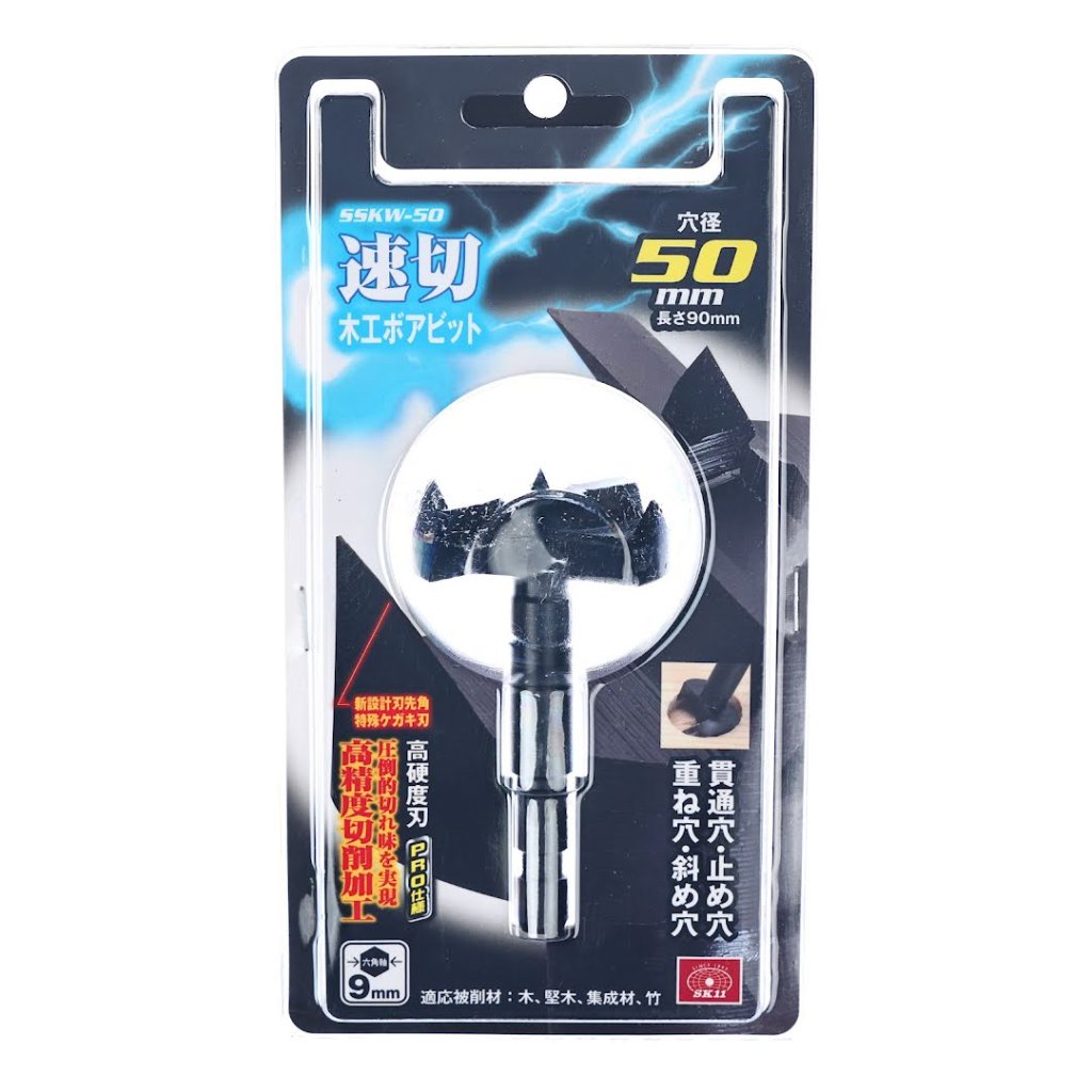 The SK11 Fast Cutting Forstner Bit, model SSKW-50, is designed for fast and precise drilling in wood, hardwood, composite materials, and bamboo. This bit features a 9 mm hex shank to prevent slippage during use and a high-hardness blade for a sharper cut compared to traditional bits. Its special scribing blade allows a more precise entry into the material. It is ideal for creating through holes, blind holes, overlapping holes, and angled holes.