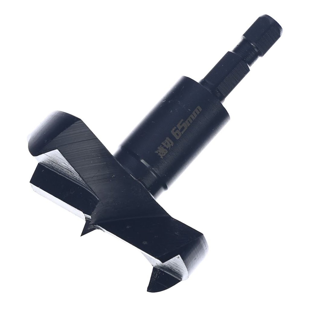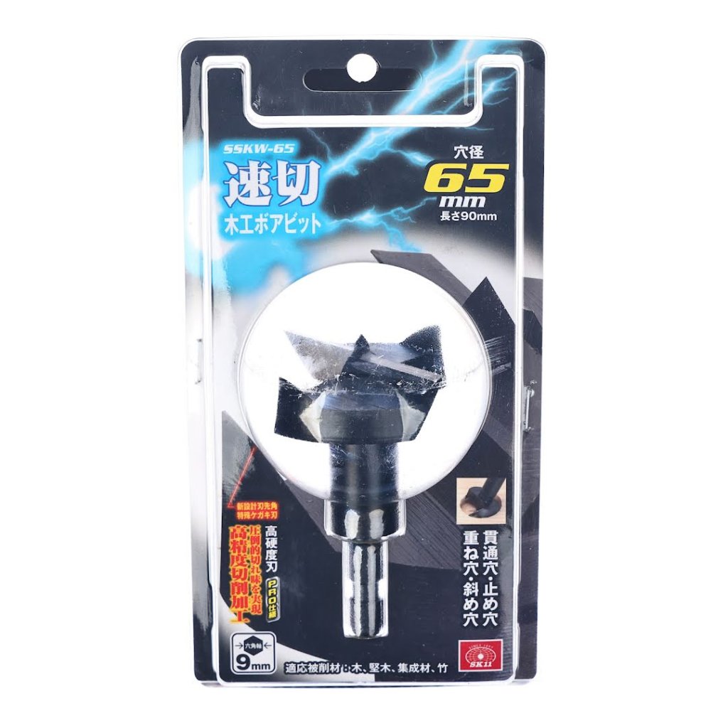 The SK11 Fast Cutting Forstner Bit, model SSKW-65, has a 9 mm hex shank and a one-piece forged construction. It is designed for quickly drilling through wood, hardwood, laminated wood, and bamboo. With a 65 mm diameter and an overall length of 90 mm, this bit allows for various hole types, including through holes, blind holes, and angled holes. Its high-hardness blade ensures sharp cutting, making it ideal for precise woodworking tasks.
