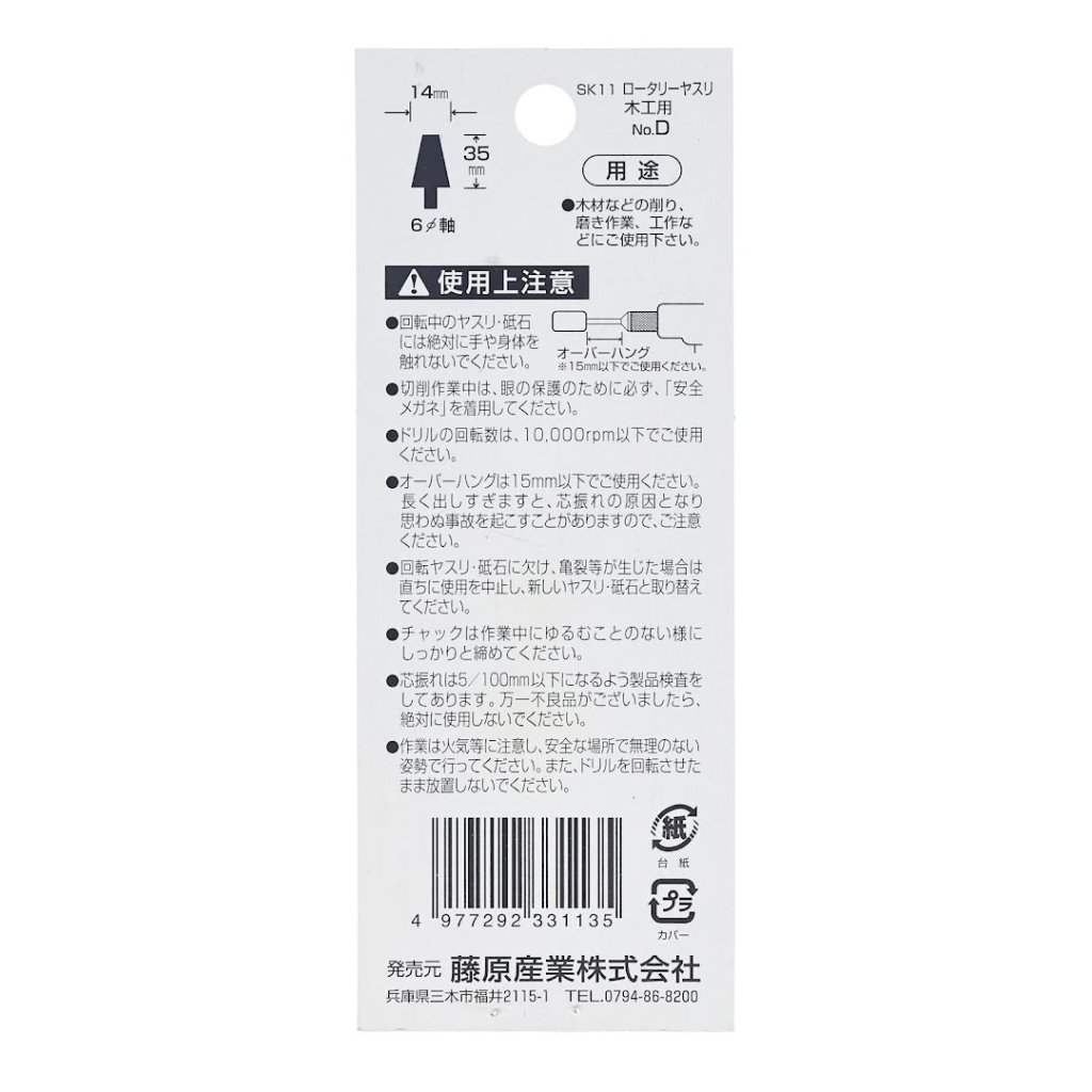 The SK11 Flat Nose Cone Rotary Burr, model No.D, is ideal for shaping, smoothing, and finishing wooden materials. Suitable for use with electric drills and air grinders, this tool ensures precision with its 6 mm shank and 14 mm grinding width. For optimal performance, use drill speeds below 10000 RPM.