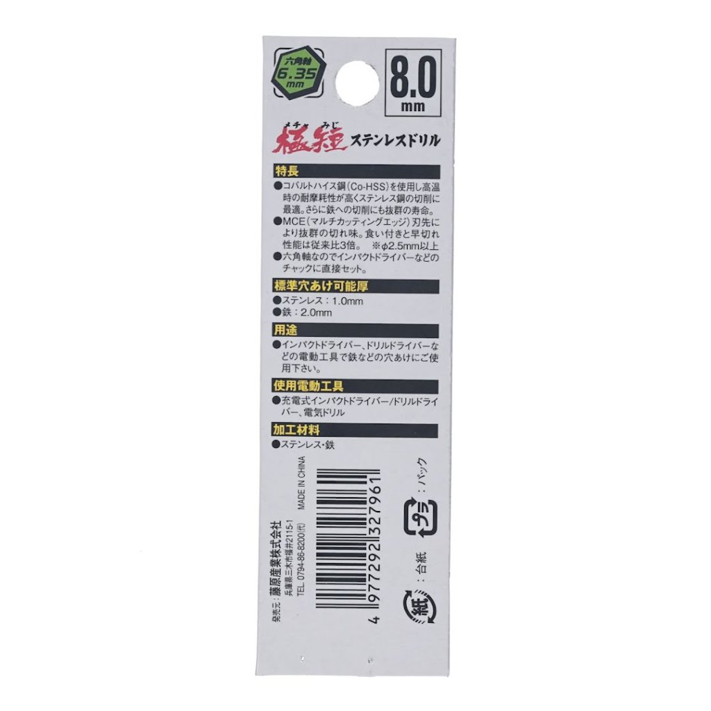 The SK11 HSS-Co Drill Bit is a highly efficient tool for drilling through stainless steel and iron. Made with high-speed steel cobalt (HSS-Co), it offers excellent wear resistance at high temperatures and ensures a long lifespan. The 6.35 mm hexagonal shank allows easy attachment to impact drivers and drill drivers. The Multi-Cutting Edge (MCE) tip enhances cutting performance, providing three times faster cutting than conventional drills. It is suitable for use with rechargeable impact drivers, drill drivers, and electric drills.
