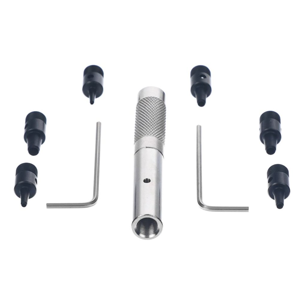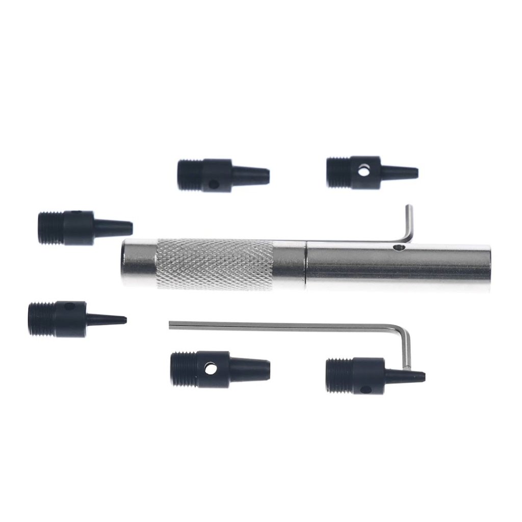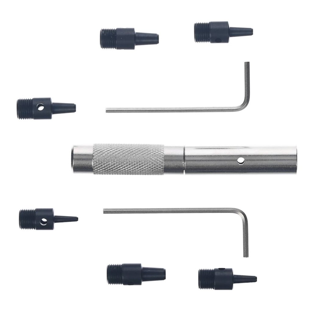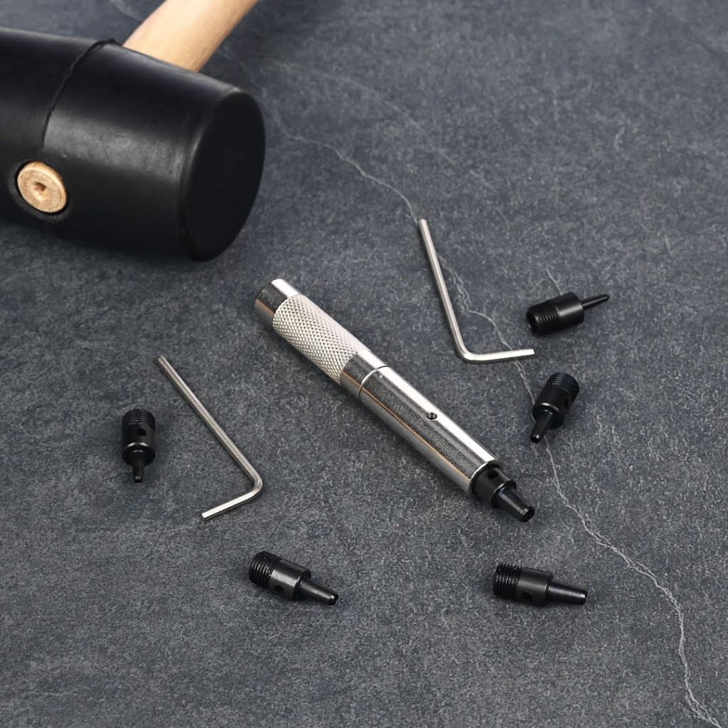 The SK11 Japanese 6-Piece Interchangeable Mini Leather Hole Punch Set is perfect for creating precise holes in leather, vinyl, rubber, and thick paper. This compact punch set includes six interchangeable heads with 1.0 to 3.5 mm diameters, allowing for versatile use. The L-shaped wrench ensures easy head replacement, and its compact size (40 x 83 x 12 mm) makes it highly portable. Ideal for detailed craftwork, this tool weighs just 80 g.