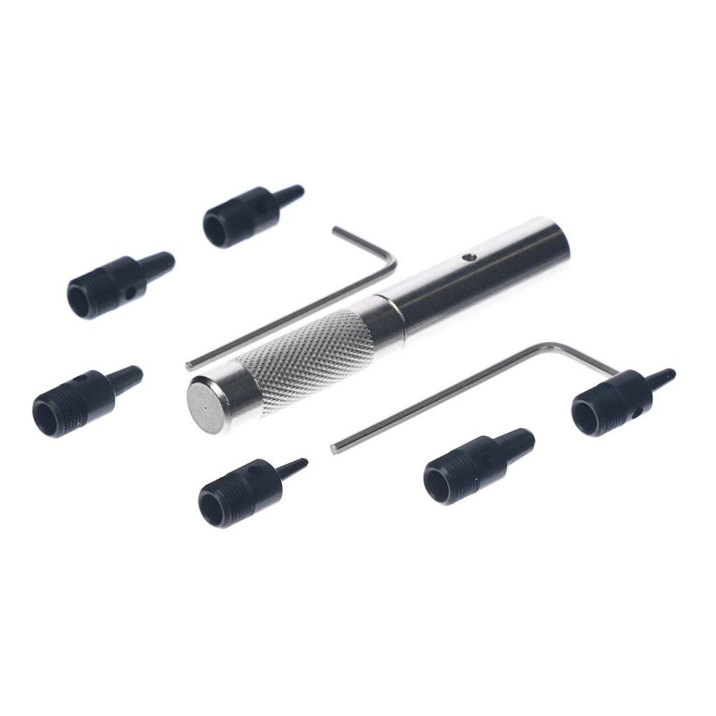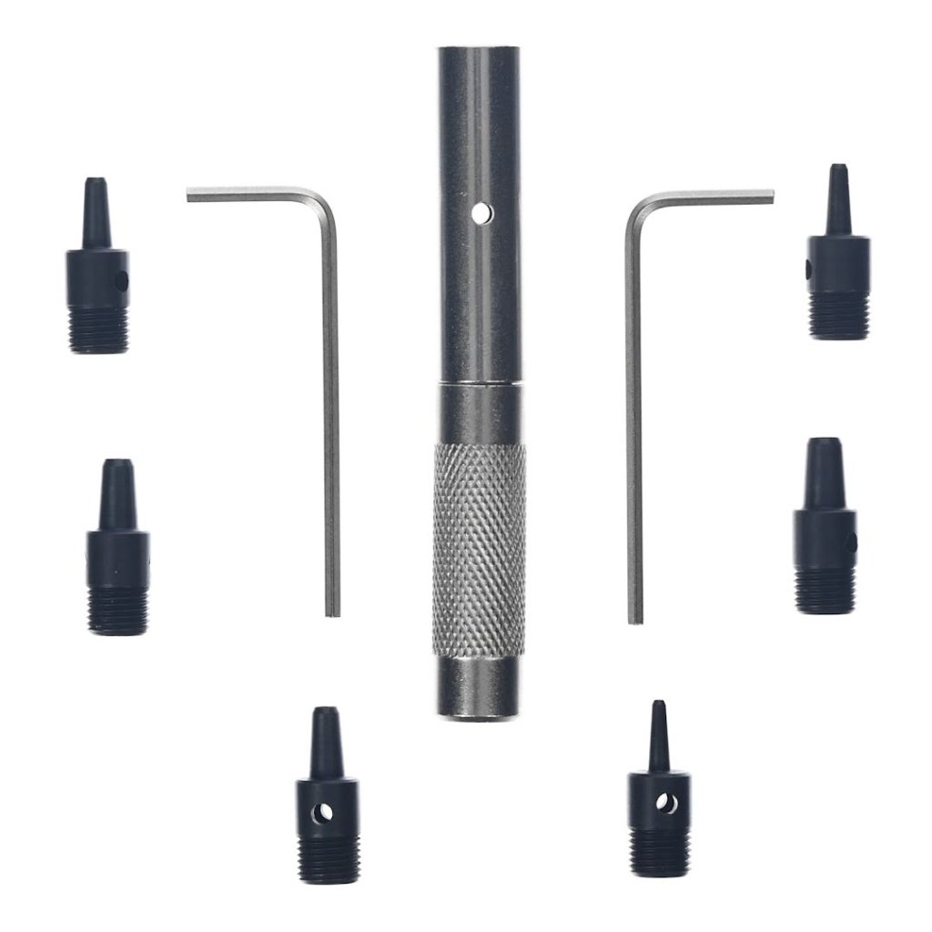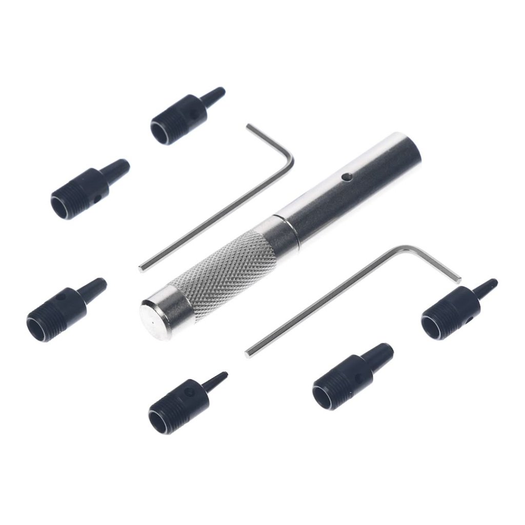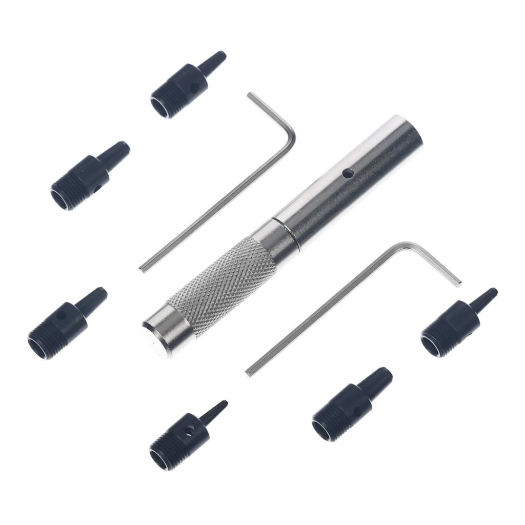 The SK11 Japanese 6-Piece Interchangeable Mini Leather Hole Punch Set is perfect for creating precise holes in leather, vinyl, rubber, and thick paper. This compact punch set includes six interchangeable heads with 1.0 to 3.5 mm diameters, allowing for versatile use. The L-shaped wrench ensures easy head replacement, and its compact size (40 x 83 x 12 mm) makes it highly portable. Ideal for detailed craftwork, this tool weighs just 80 g.