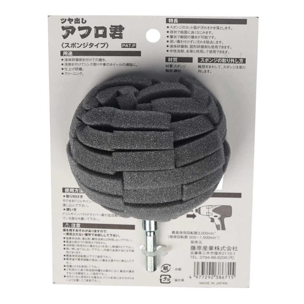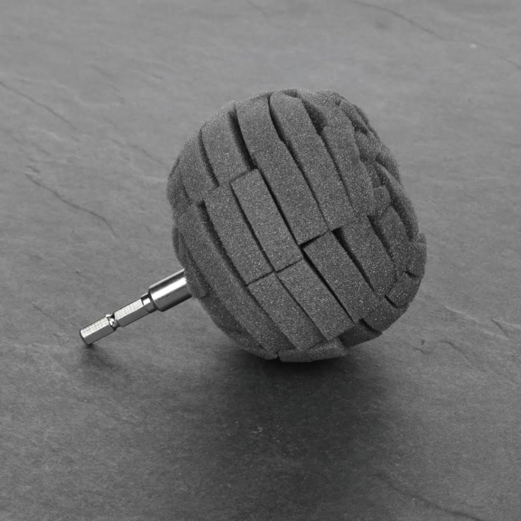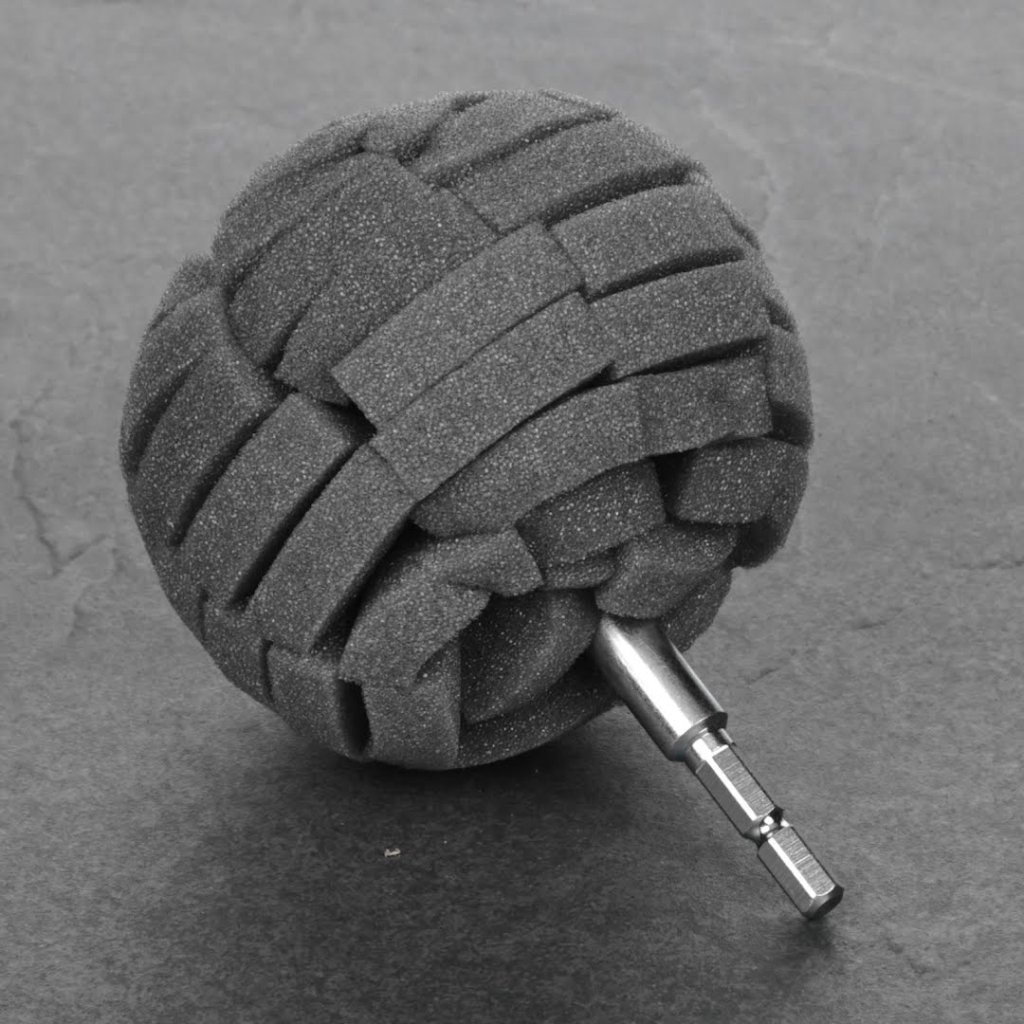 The SK11 Japanese Abrasive Polishing Sponge Ball is designed for effortless polishing work using a household electric drill. This 90 mm sponge is ideal for various tasks, including applying liquid polishing agents, cleaning sinks, and polishing car wheels. The sponge's cut surface effectively scrapes off dirt and adapts well to curved surfaces, allowing for precise polishing. With a hexagonal shaft and a maximum rotation speed of 3000 RPM, this tool is perfect for achieving a clean finish without deep scratches. It is suitable for liquid and solid polishing agents and retains enough water for washing cars and bicycles.
