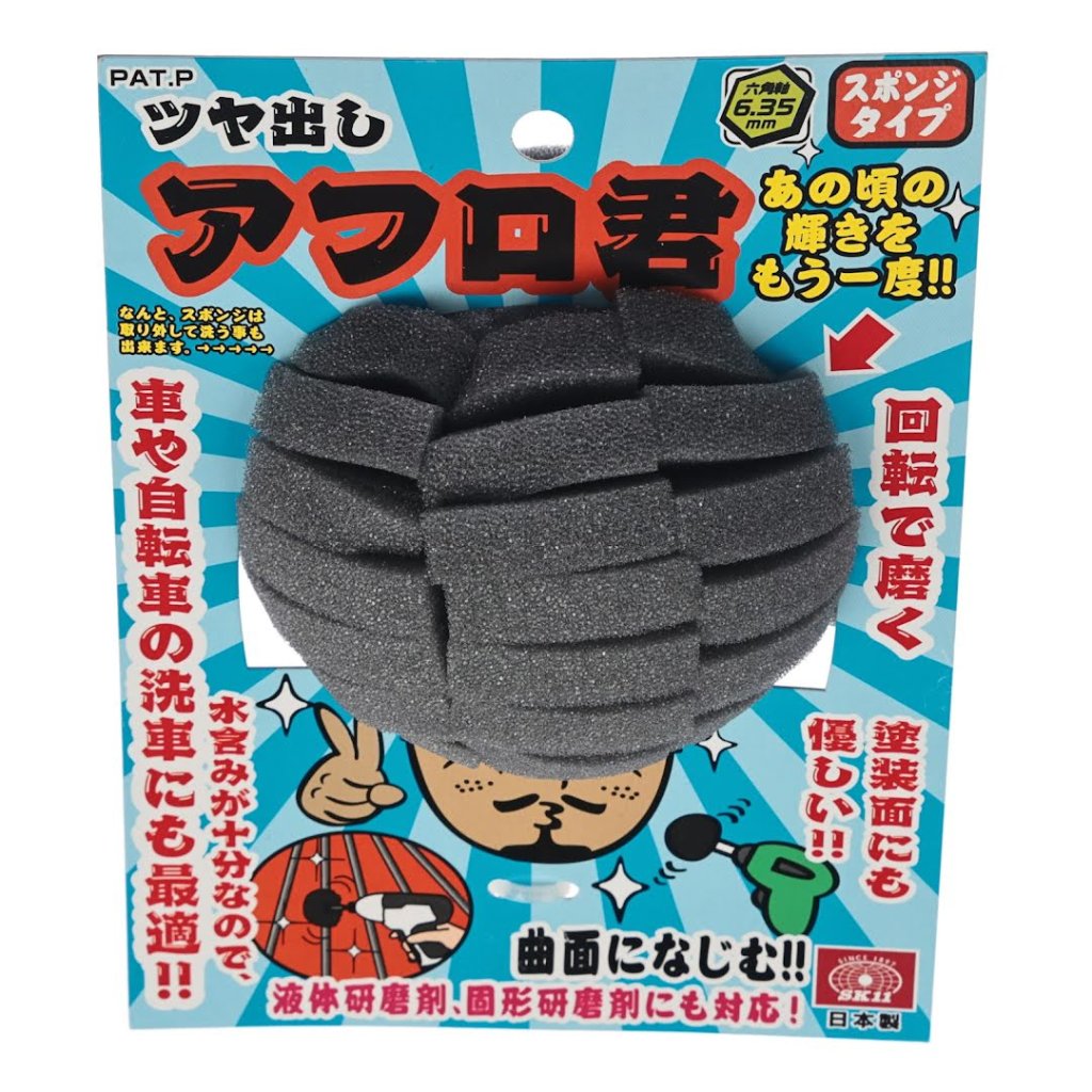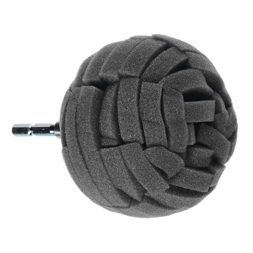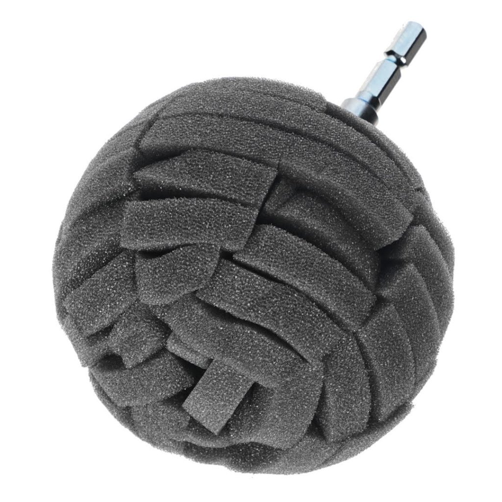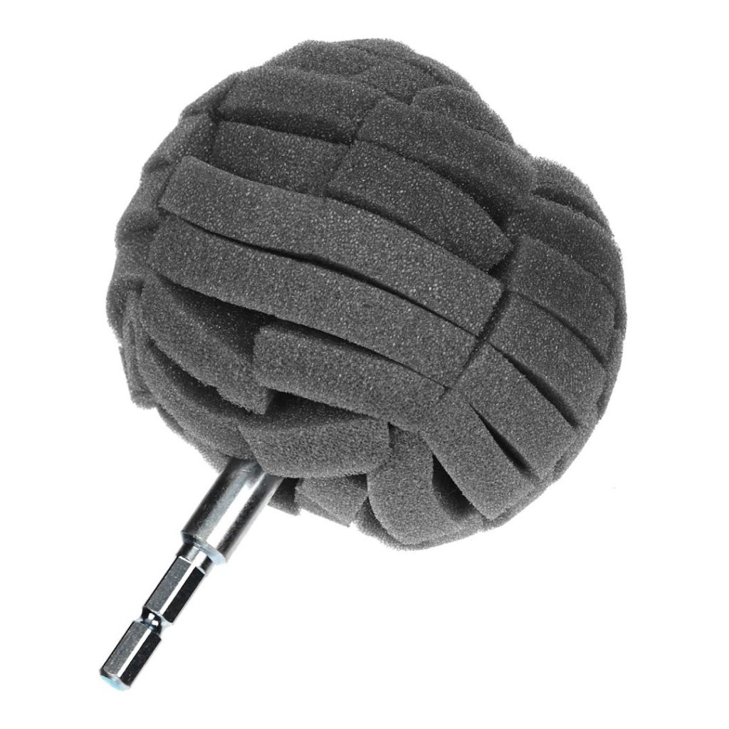 The SK11 Japanese Abrasive Polishing Sponge Ball is designed for effortless polishing work using a household electric drill. This 90 mm sponge is ideal for various tasks, including applying liquid polishing agents, cleaning sinks, and polishing car wheels. The sponge's cut surface effectively scrapes off dirt and adapts well to curved surfaces, allowing for precise polishing. With a hexagonal shaft and a maximum rotation speed of 3000 RPM, this tool is perfect for achieving a clean finish without deep scratches. It is suitable for liquid and solid polishing agents and retains enough water for washing cars and bicycles.