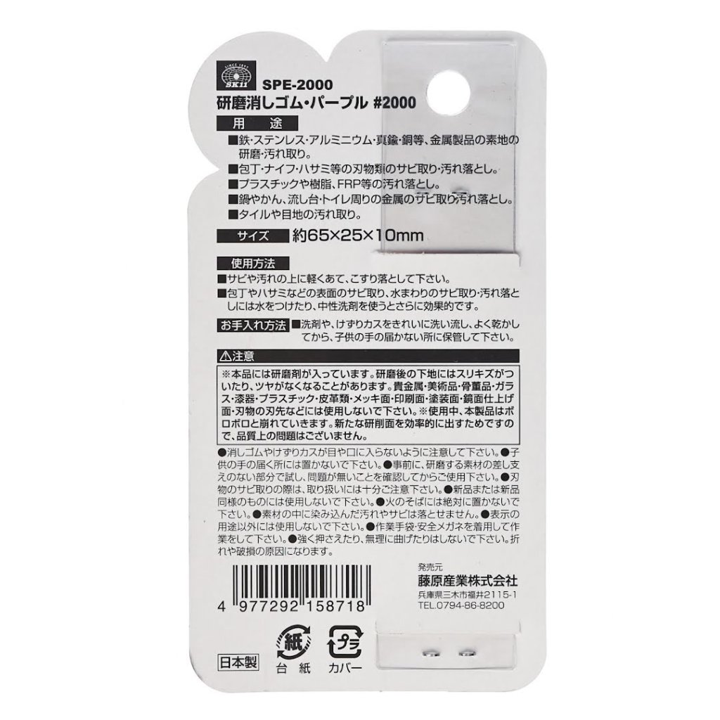 The SK11 Japanese Abrasive Rubber Block, model SPE-2000, is a versatile tool designed for cleaning and finishing polishing tasks on metal and resin products. Measuring approximately 65 x 25 x 10 mm and weighing 33 g, this block is made of natural rubber, making it elastic and easy to fit on curved surfaces. It can be easily cut to your preferred size and provides a consistently fresh abrasive surface, reducing clogging. For enhanced performance, especially in wet conditions, use it with a neutral detergent.