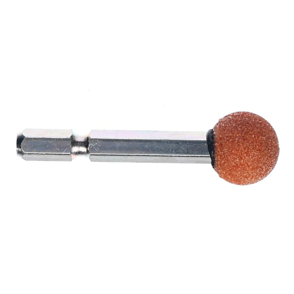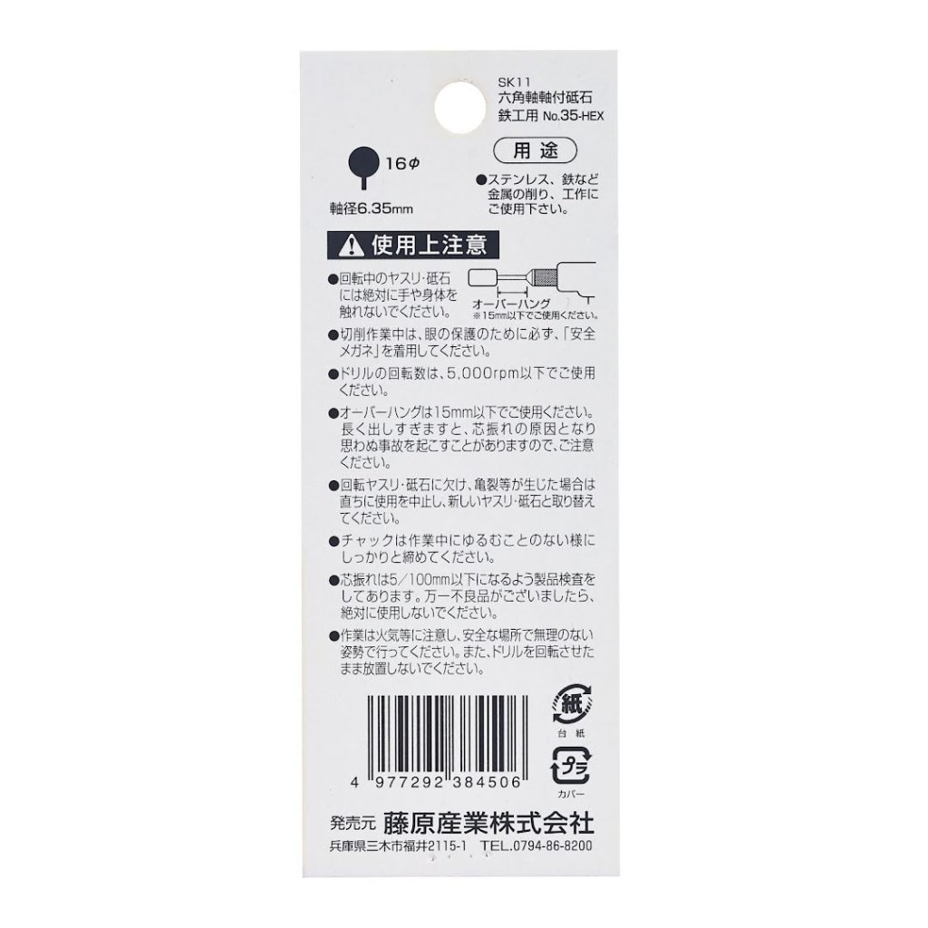 The SK11 Japanese Abrasive Stone Point No.35-HEX is designed for polishing stainless steel and iron. Its 6.35 mm hexagonal shaft can be easily attached to an impact driver for efficient use. Measuring 16 x 16 mm and weighing 20 g, this tool is ideal for various metalworking tasks. It operates at a maximum rotation speed of 5000 RPM and features a grain size of WA60MV.