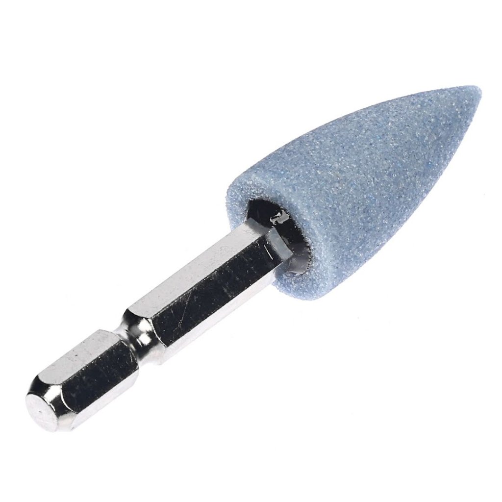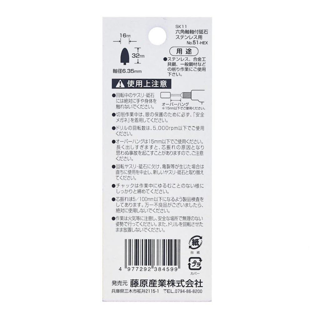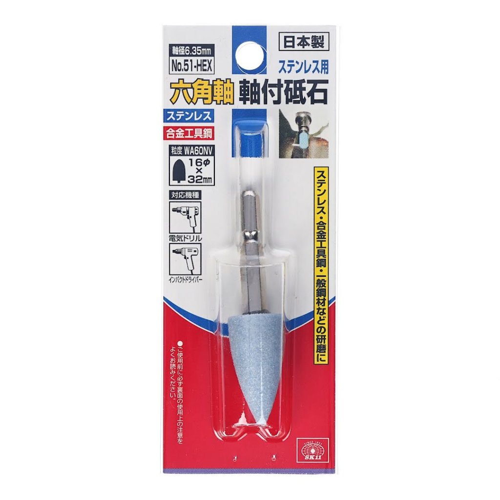 The SK11 Japanese Abrasive Stone Point, model No.51-HEX, is designed for grinding stainless steel and other general metals. It features a 6.35 mm hex shank and is compatible with electric drills and impact drivers, allowing for stable and efficient operation even at low speeds. The abrasive grain composition is optimized for low-RPM grinding, making it ideal for polishing tough stainless steel. With its bullet-shaped design and WA material, this abrasive stone ensures high performance and durability.