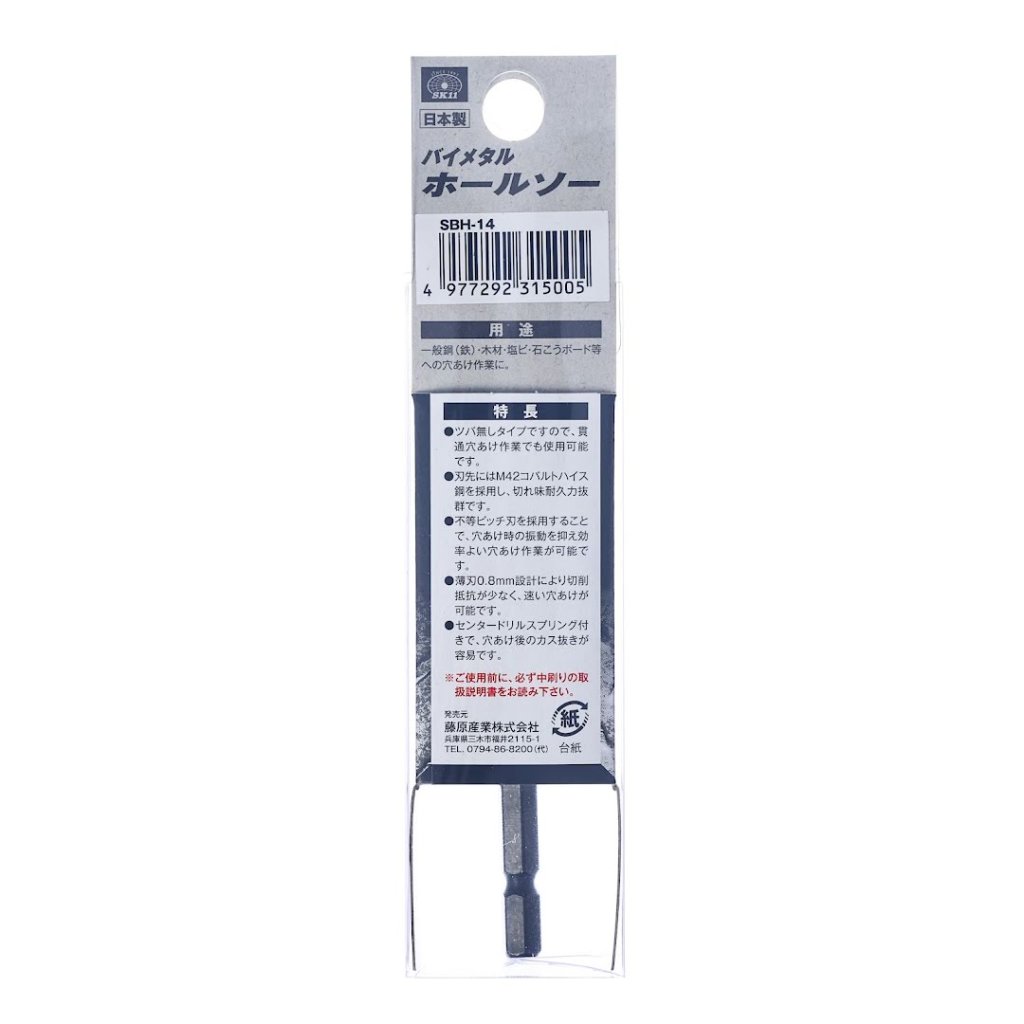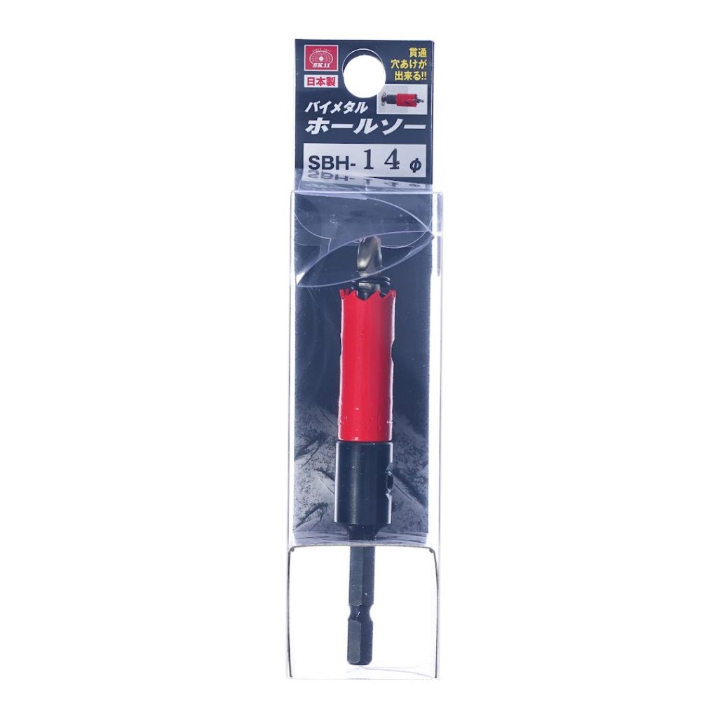 The SK11 Japanese Bimetal Hole Saw, model SBH-14, is designed for efficient drilling through various materials, including general steel, wood, PVC, and gypsum board. This 14 mm hole saw features an M42 cobalt high-speed steel blade for exceptional cutting performance and durability. Its 0.8 mm thin blade design reduces cutting resistance, enabling faster drilling. Additionally, the center drill spring makes it easy to remove waste after drilling, enhancing overall efficiency. It is suitable for electric drills operating at 600-1200 RPM.