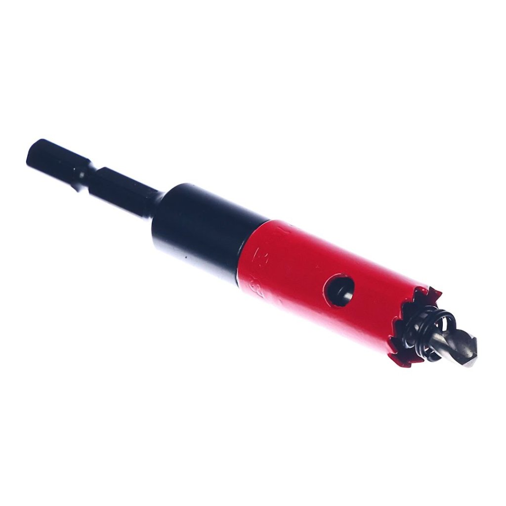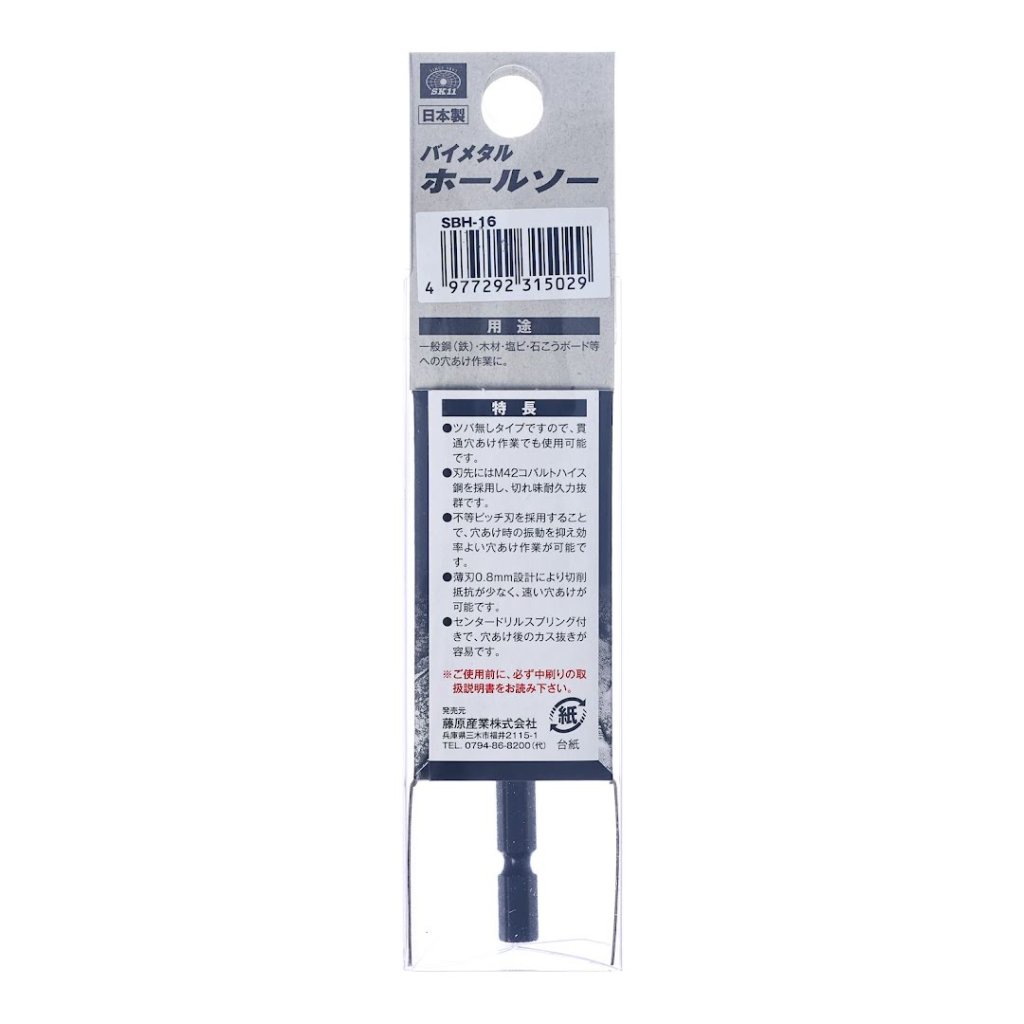 The SK11 Japanese Bimetal Hole Saw, model SBH-16, is designed for efficient and precise hole cutting in general steel, wood, PVC, and gypsum boards. Its compact size is 16 mm in diameter, perfect for various DIY and professional tasks. Featuring M42 cobalt high-speed steel teeth, it ensures excellent cutting performance and durability. The non-flanged design allows through-hole drilling, while the uneven-pitch blades minimize vibration for smoother operation. The 0.8 mm thin blade design reduces cutting resistance, enabling faster cuts. The center drill spring makes it easy to remove debris after drilling. It is ideal for electric drills and operates best at 600-1200 RPM for metalworking.