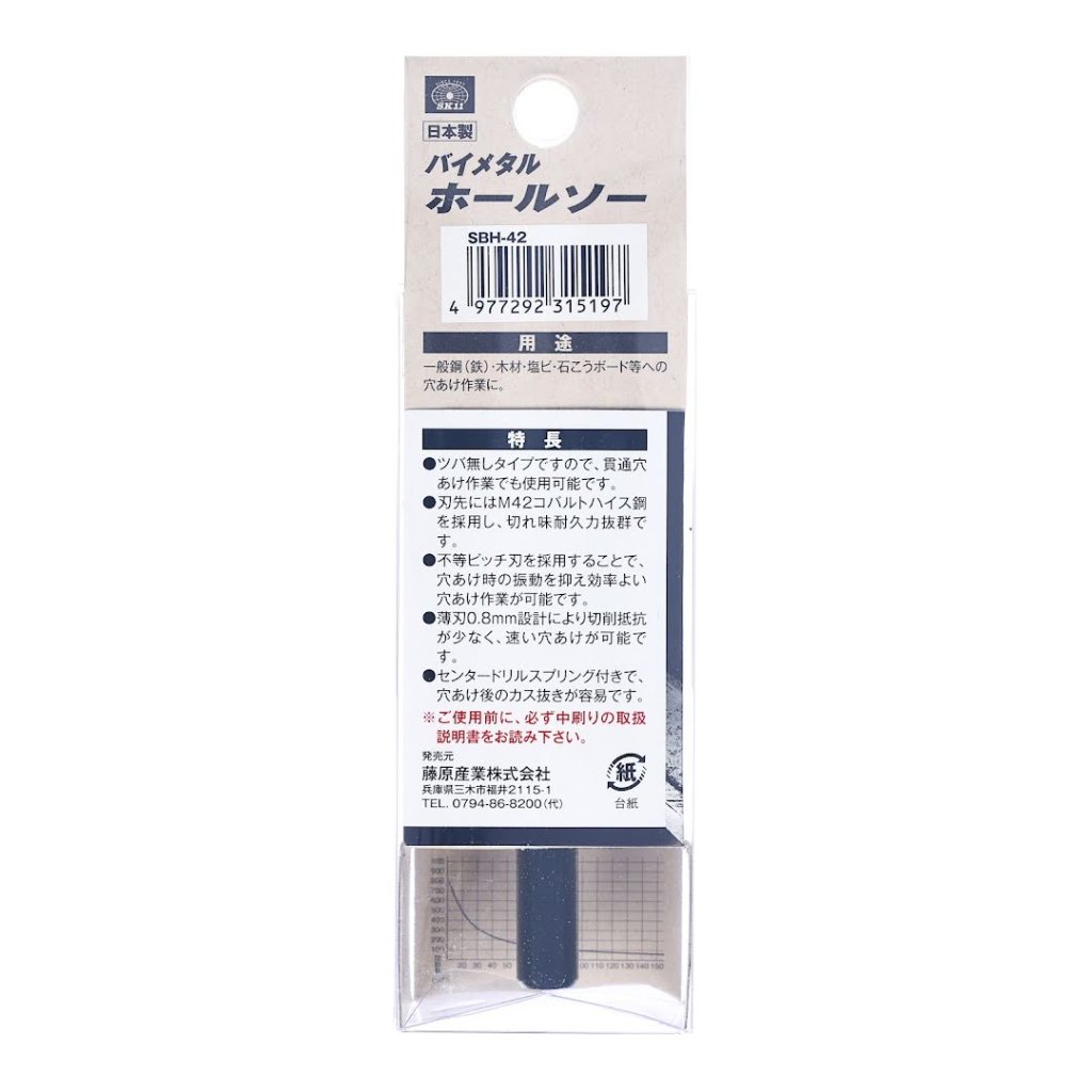The SK11 Japanese Bimetal Hole Saw, model SBH-42, is designed for precision hole drilling in general steel, wood, PVC, and gypsum boards. It features an M42 cobalt high-speed steel blade with exceptional sharpness and durability. The non-flanged design allows through-hole drilling, and the unequal pitch teeth help reduce vibration for efficient operation. The blade thickness of 0.8 mm minimizes cutting resistance for faster drilling.