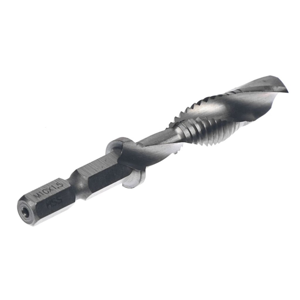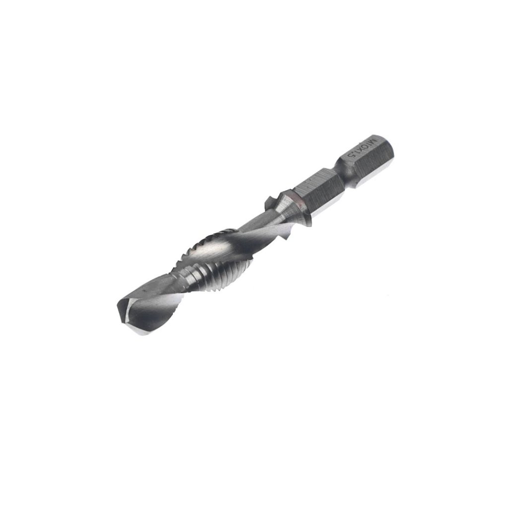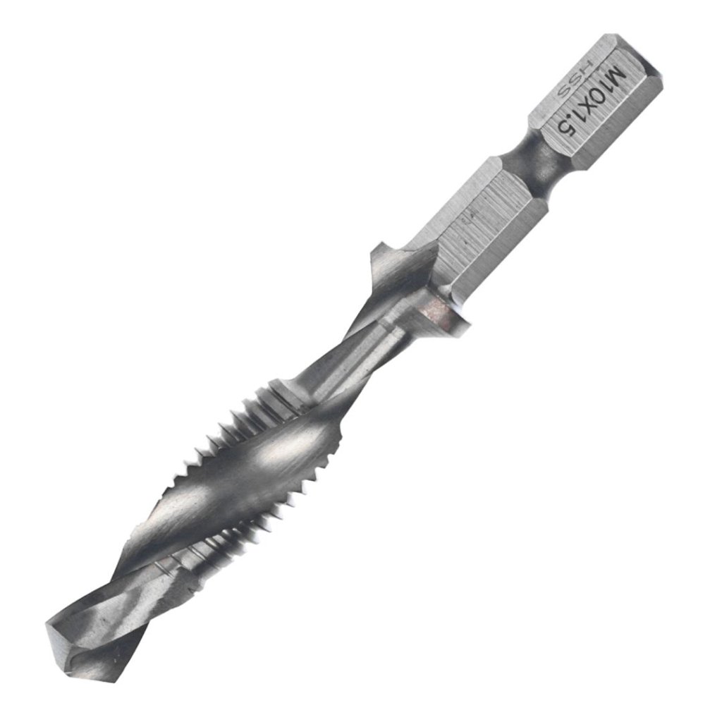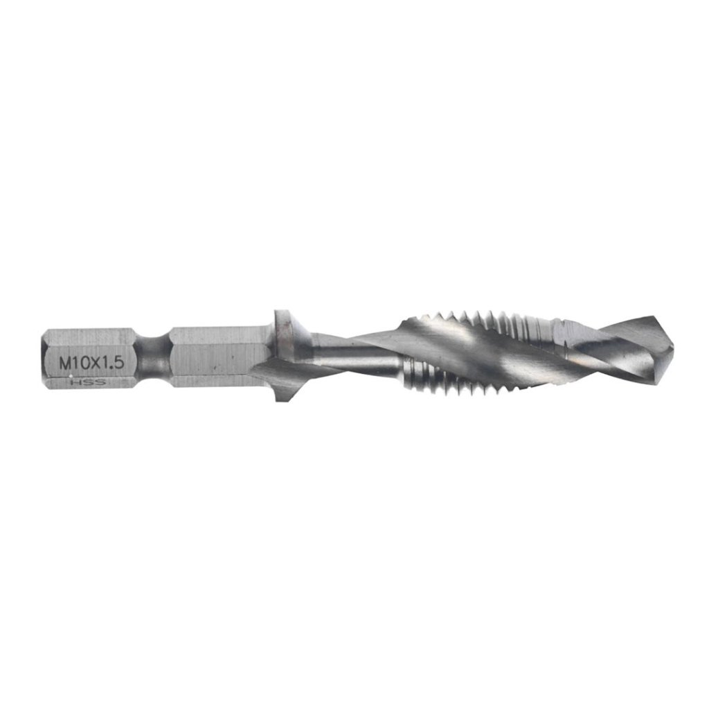 The SK11 Japanese Combined Drill and Tap Bit is a versatile tool for tapping operations on iron plates, non-ferrous metals, and resins. This 6.35 mm hex shank bit allows for simultaneous pre-drilling and threading, enhancing efficiency. It is compatible with forward and reverse rotation electric drills and suitable for materials up to 6 mm thick. The bit size is M10 with a 1.5 mm pitch. Ensure the drill has a reversible function for optimal use.