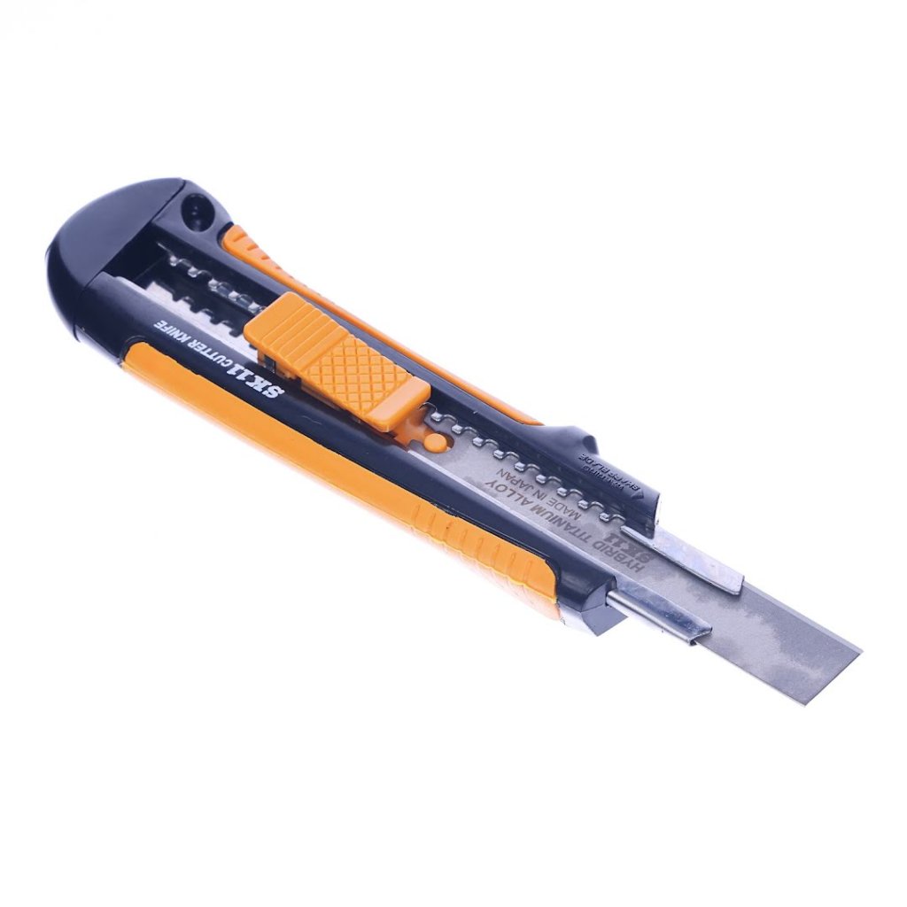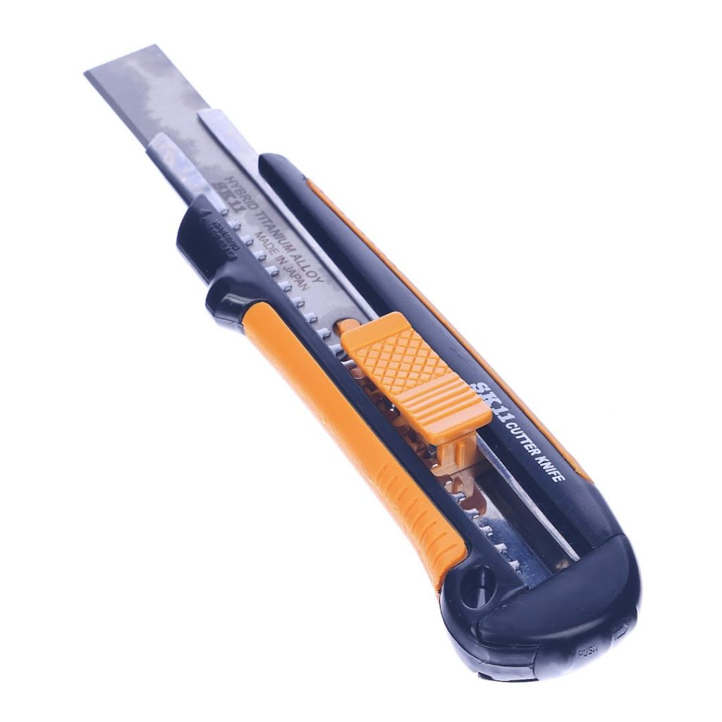 The SK11 Japanese Cutter Knife, model SF-4, is a versatile tool designed for precision and durability. It features a silver-titanium alloy blade with high wear and chemical resistance, which is ideal for cutting thick paper, rubber, vinyl, and magnetic tape. This blade is made from a hybrid material containing titanium powder, metal ceramics, and silver, offering excellent antibacterial properties and the ability to reduce germs such as O-157. Its non-magnetic nature makes it suitable for use around sensitive electronic equipment without causing interference. The scraper has a non-slip rubber grip and a convenient auto-lock mechanism, ensuring comfort and safety.